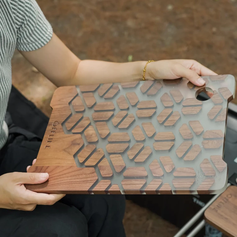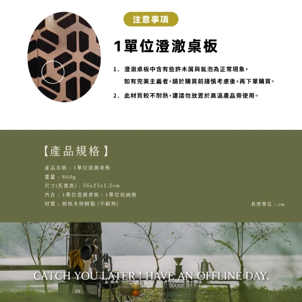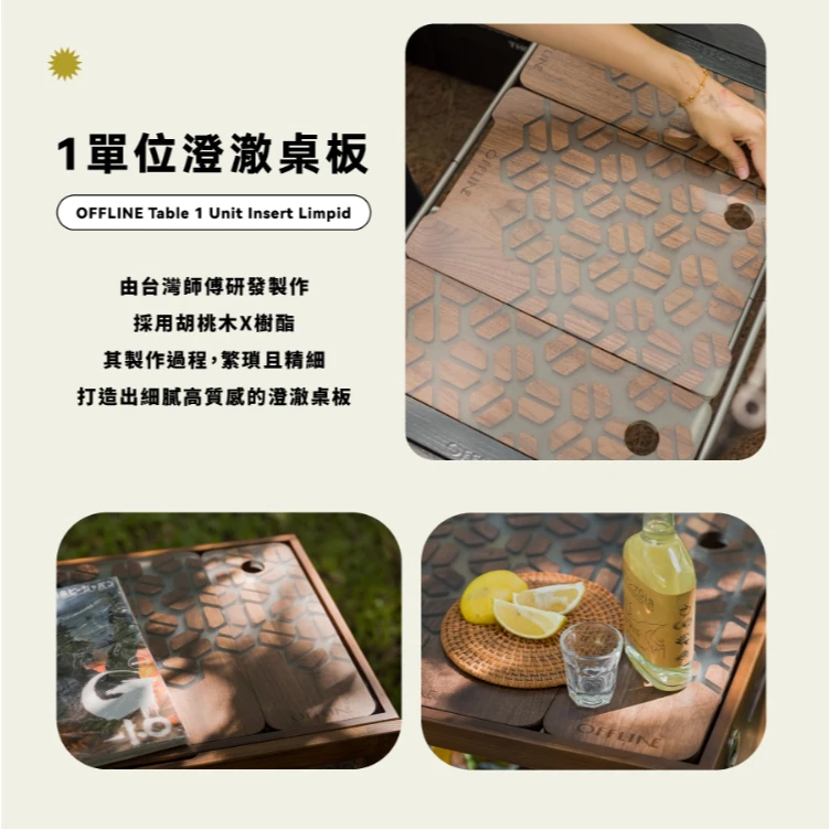 🔸OFFLINE一單位澄澈桌板,採用胡桃木與樹酯拼接而成,胡桃木屬於密度高的硬木,