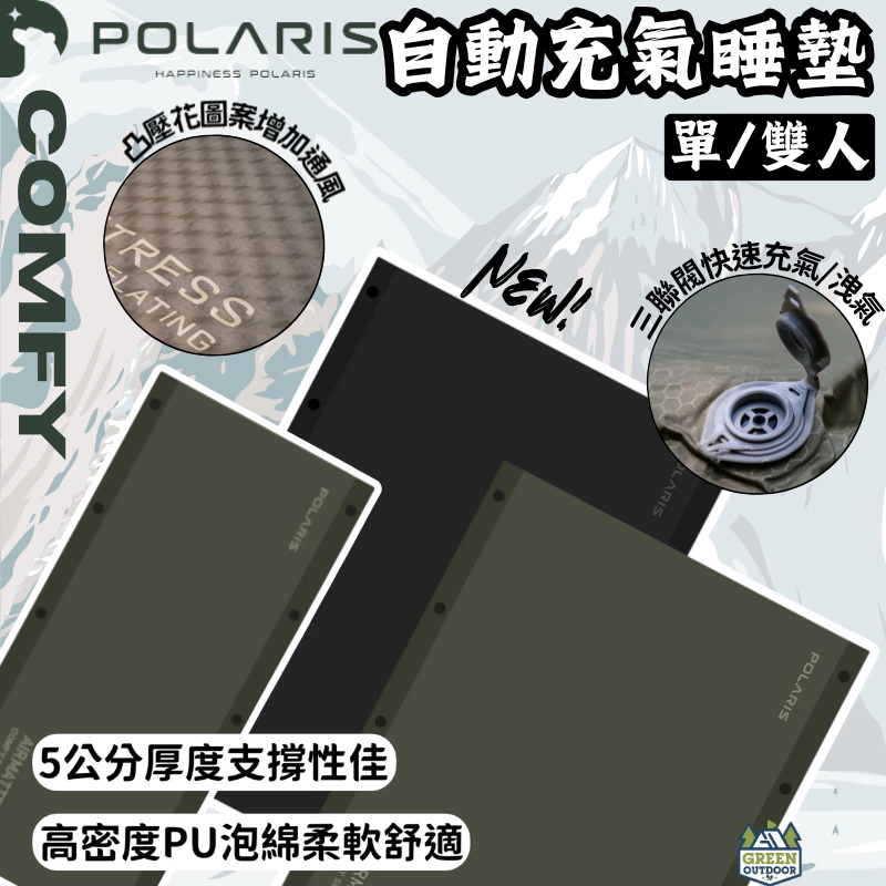 POLARIS北極星 COMFY自動充氣睡墊單/雙人【綠色工場】 充氣睡墊 露營睡墊 乳膠墊 充氣床 睡墊 氣墊床