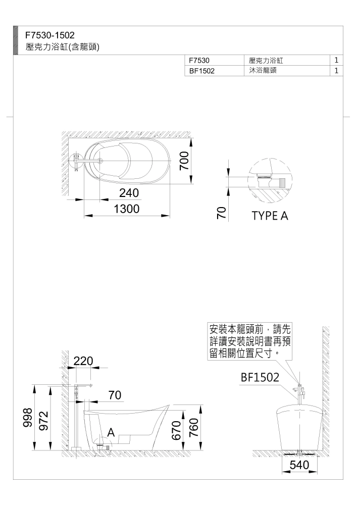 F7530浴缸 NT$ 59,500