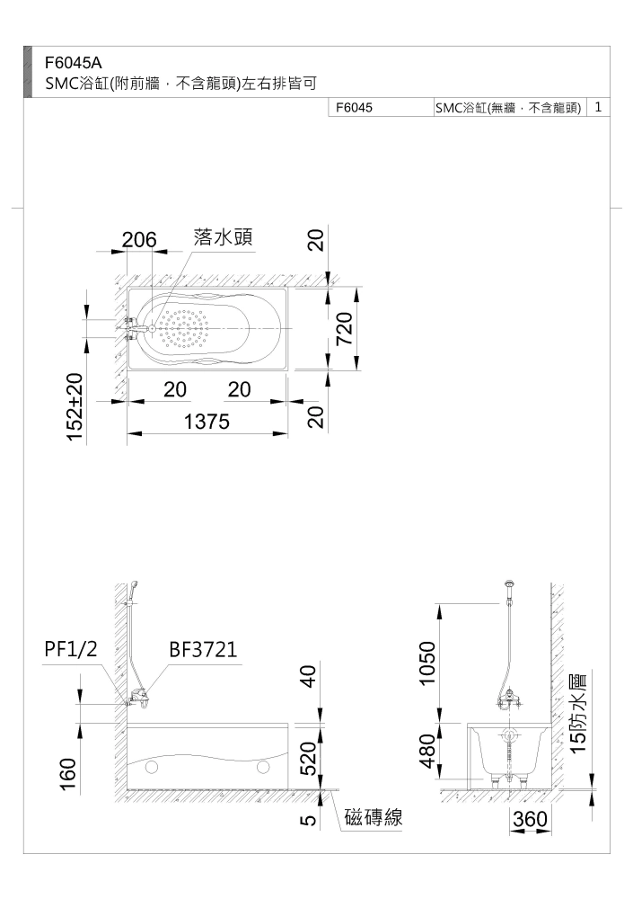 F6045 SMC浴缸(無牆,不含龍頭) NT$ 13,800