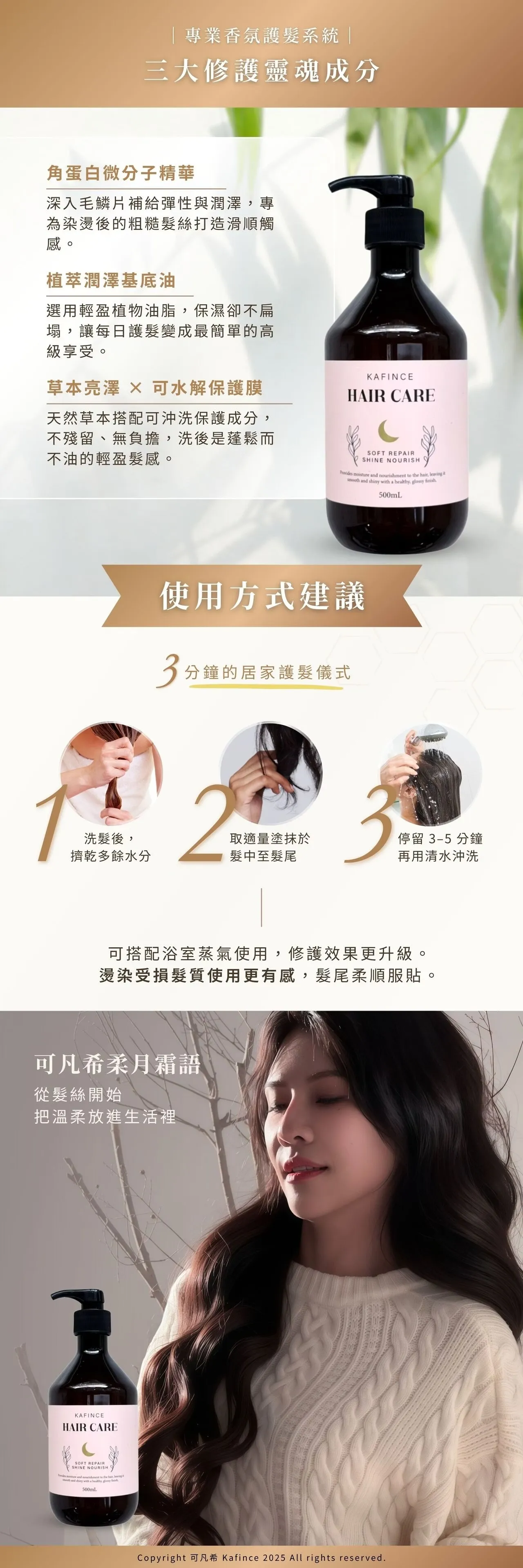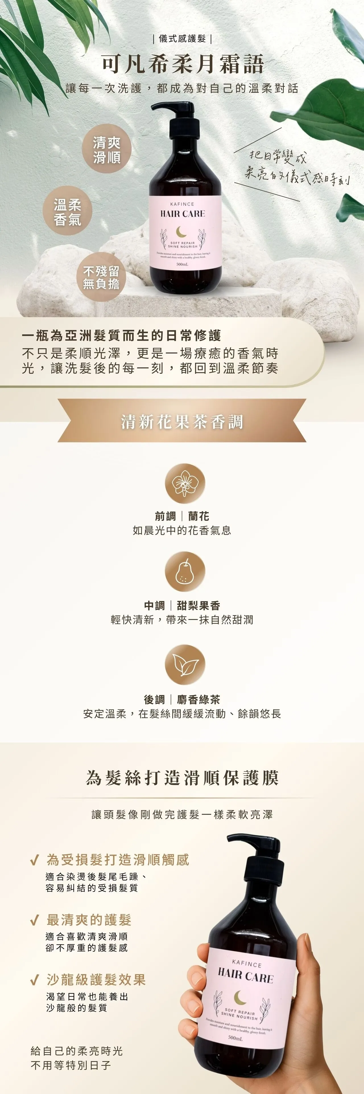 Kafince 相信「柔亮日常」是好髮質的關鍵。用一瓶結合修護與儀式感的護髮素,累積你想要的柔順質地,讓每一次護髮都成為值得期待的溫柔時刻。
