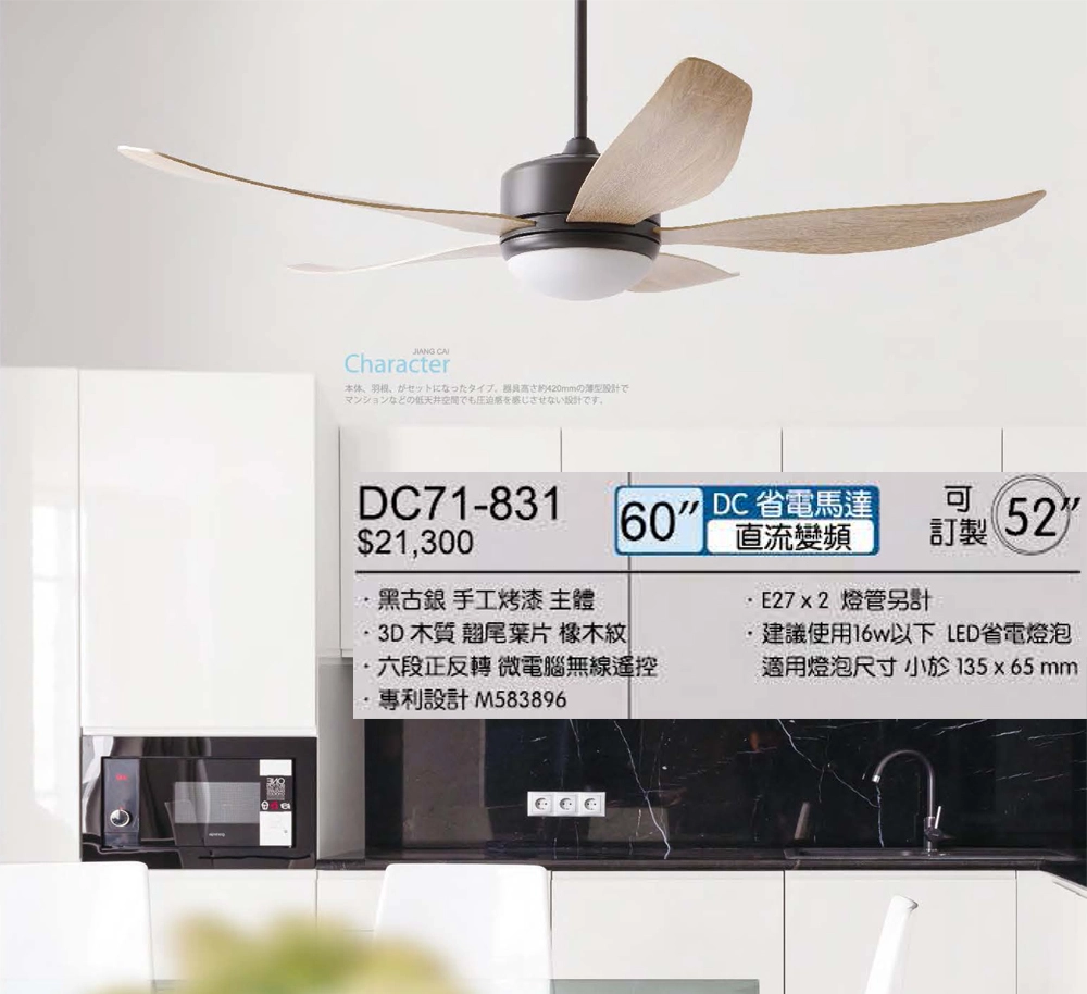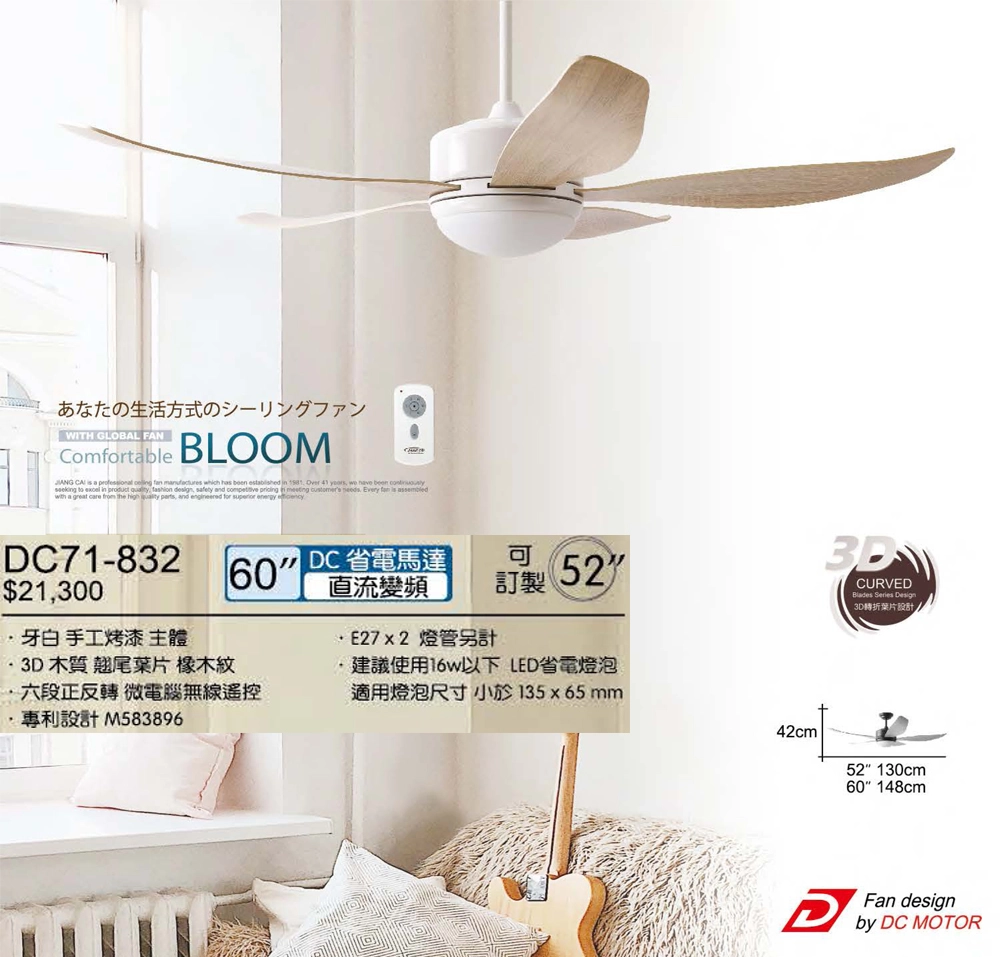 商品將財 台灣製 62吋DC吊扇+燈具附遙控器110V DC91-932白/DC91-931黑