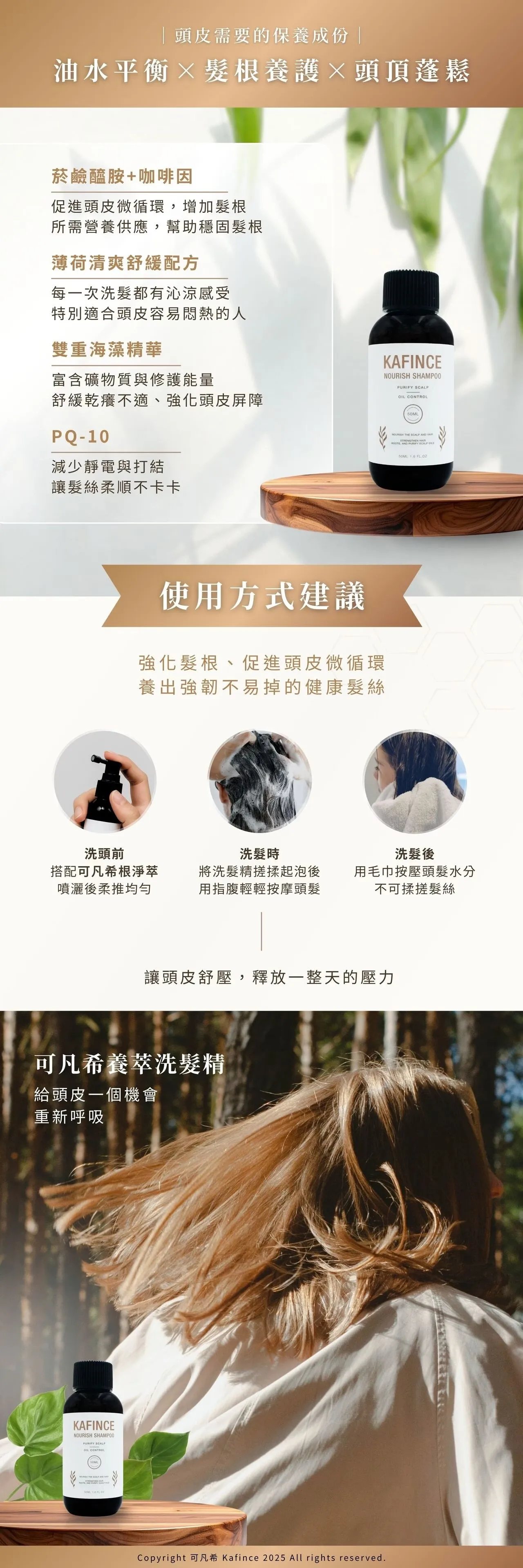 溫和清潔系統帶走油脂與髒汙,同步維持頭皮舒適度。加入維他命B3與咖啡因帶來輕盈清爽的洗後觸感,薄荷醇增添微涼感;褐藻系萃取(海蘊、指狀海帶)補充潤澤調理元素,Polyquaternium-10 協助提升梳理度,洗後髮絲不易打結、蓬鬆有型。