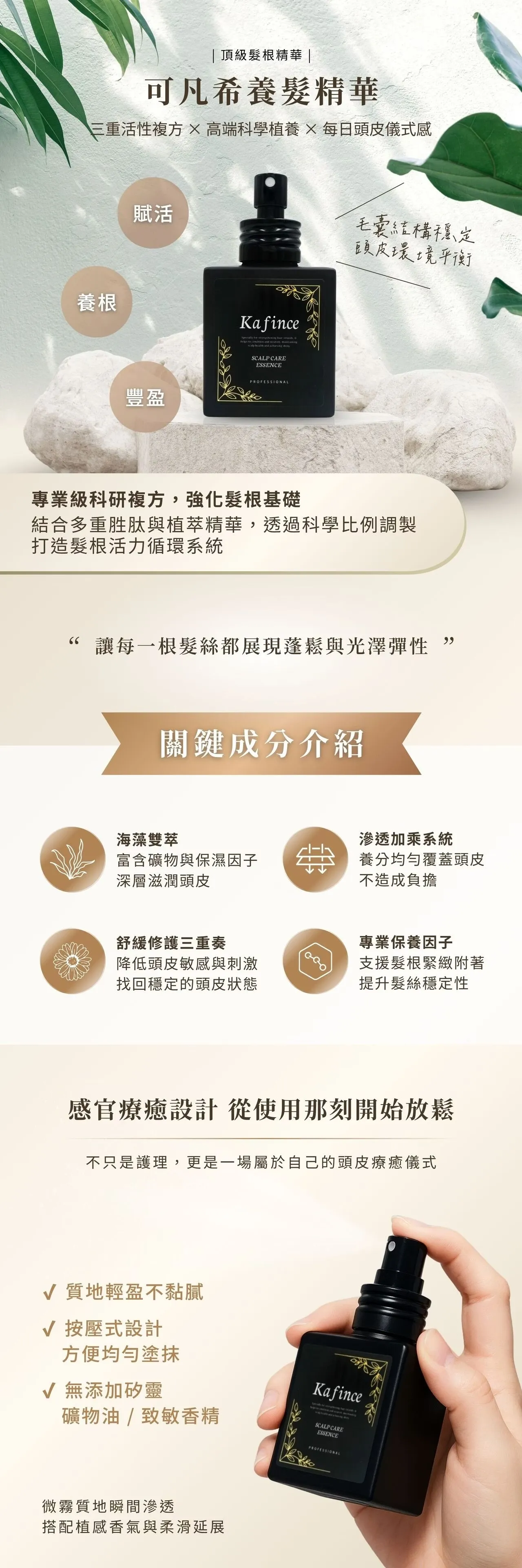 水感基底清爽不黏膩,搭配羽藻、指狀海帶等海藻萃取,並結合 Apigenin、齊墩果酸、生物素三肽-1 等複合養護分子,協助頭皮維持良好狀態與髮根輕盈感;洋甘菊萃取與二鉀甘草酸溫和調理,讓外在刺激引起的不適感降到最低,日常持續使用就能穩穩建立健康平衡。