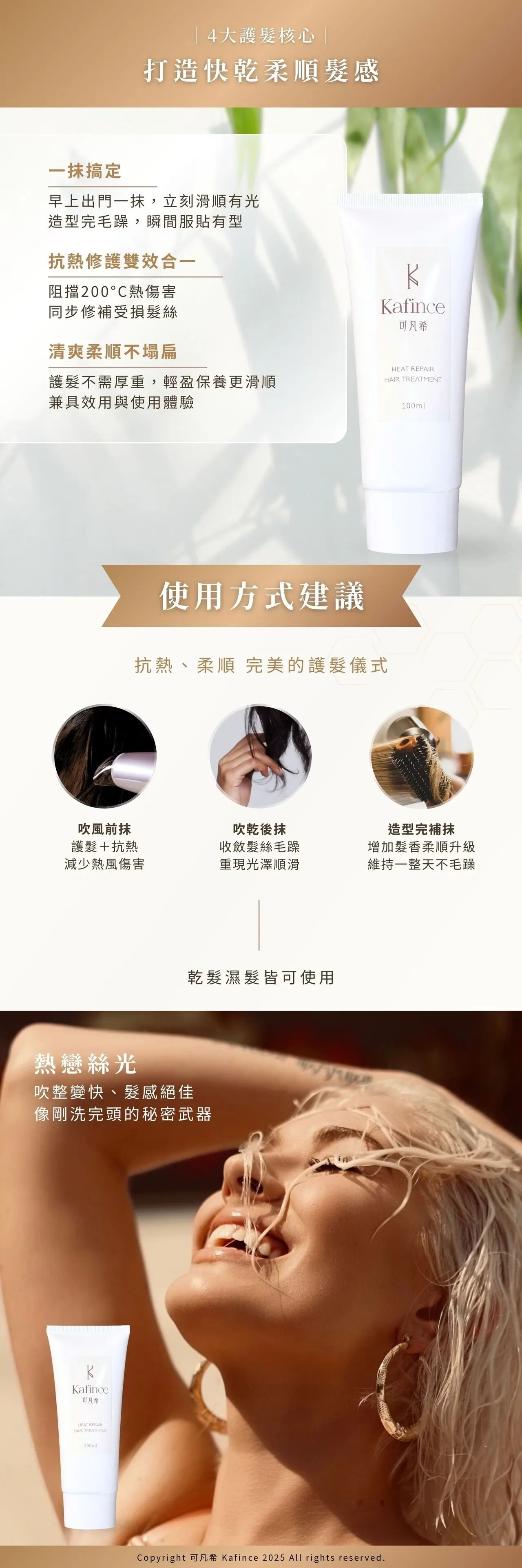 為日常造型打造更順手的基底,熱戀絲光以水感乳狀配方搭配多元保濕與調理元素:甘油、蜂蜜衍生物與水解大豆蛋白協同補水與潤澤,讓髮絲摸起來更柔軟、看起來更有光澤;