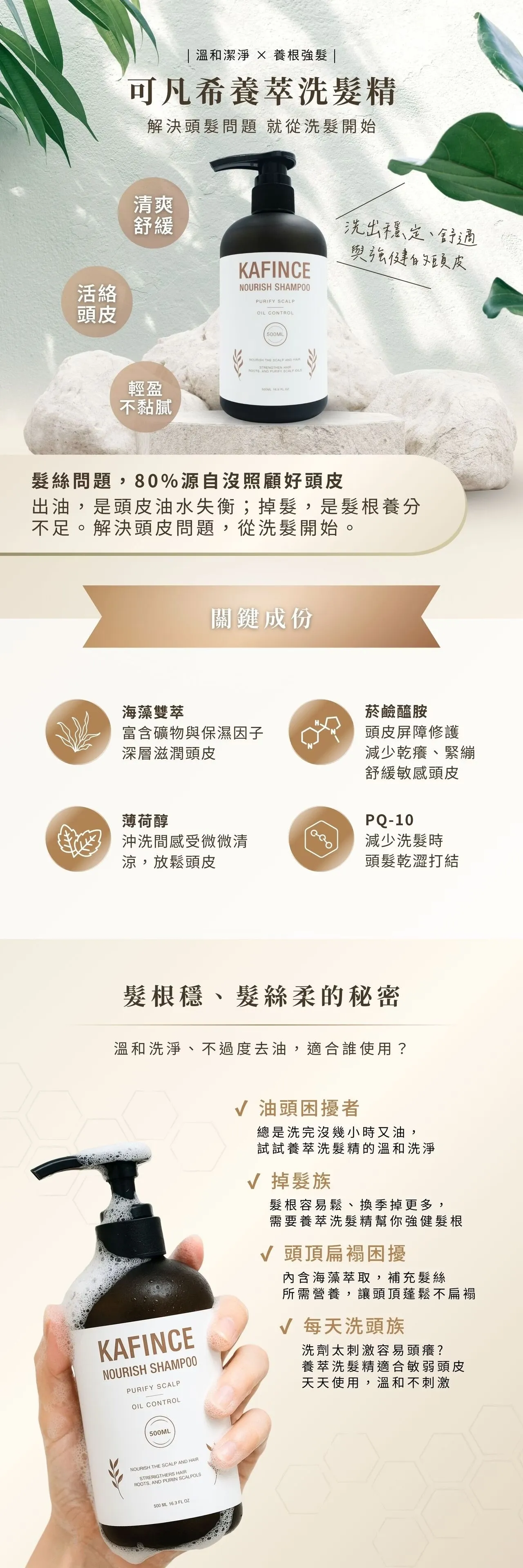 Kafince 相信「日常養護」是打造好質感的關鍵。用一瓶平衡清潔與調理的洗髮精,累積你想要的髮絲狀態,讓每次洗髮都變得值得期待。