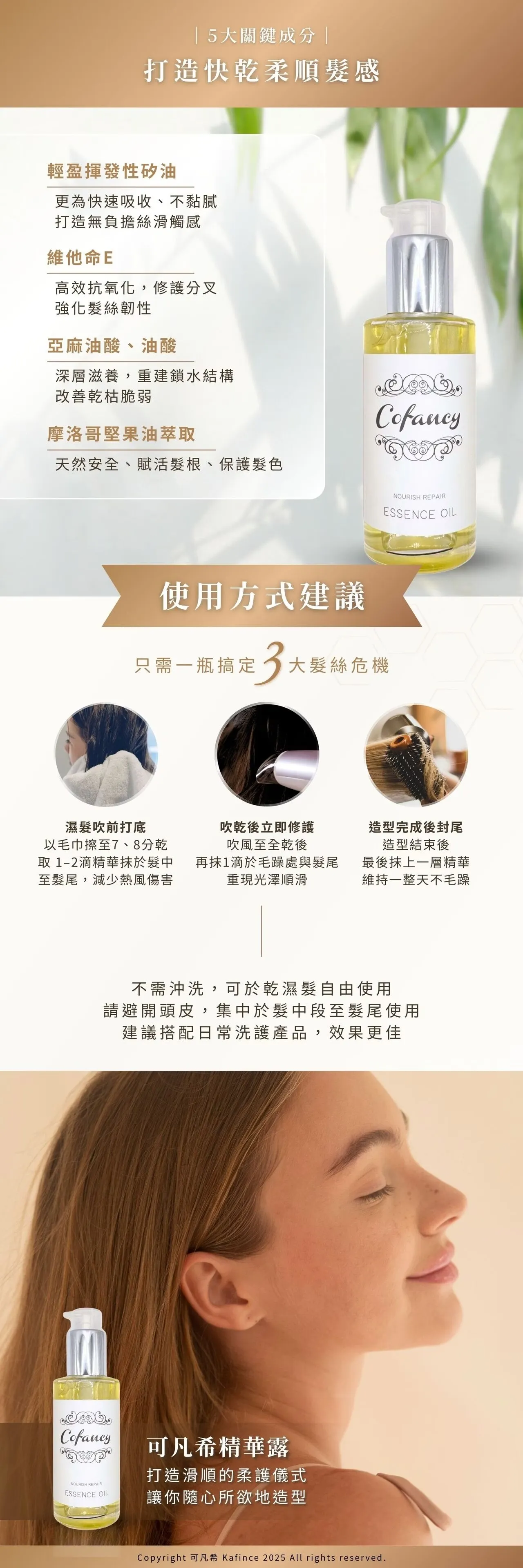 Kafince 可凡希精華露以輕透滑順的質地為核心,快速在髮絲表層形成保護膜,幫助撫平毛躁、提升滑順與光澤感;同時加入珍貴植物油脂(摩洛哥堅果油來源),為乾燥部位補充潤澤,使髮絲更柔軟、易梳理。