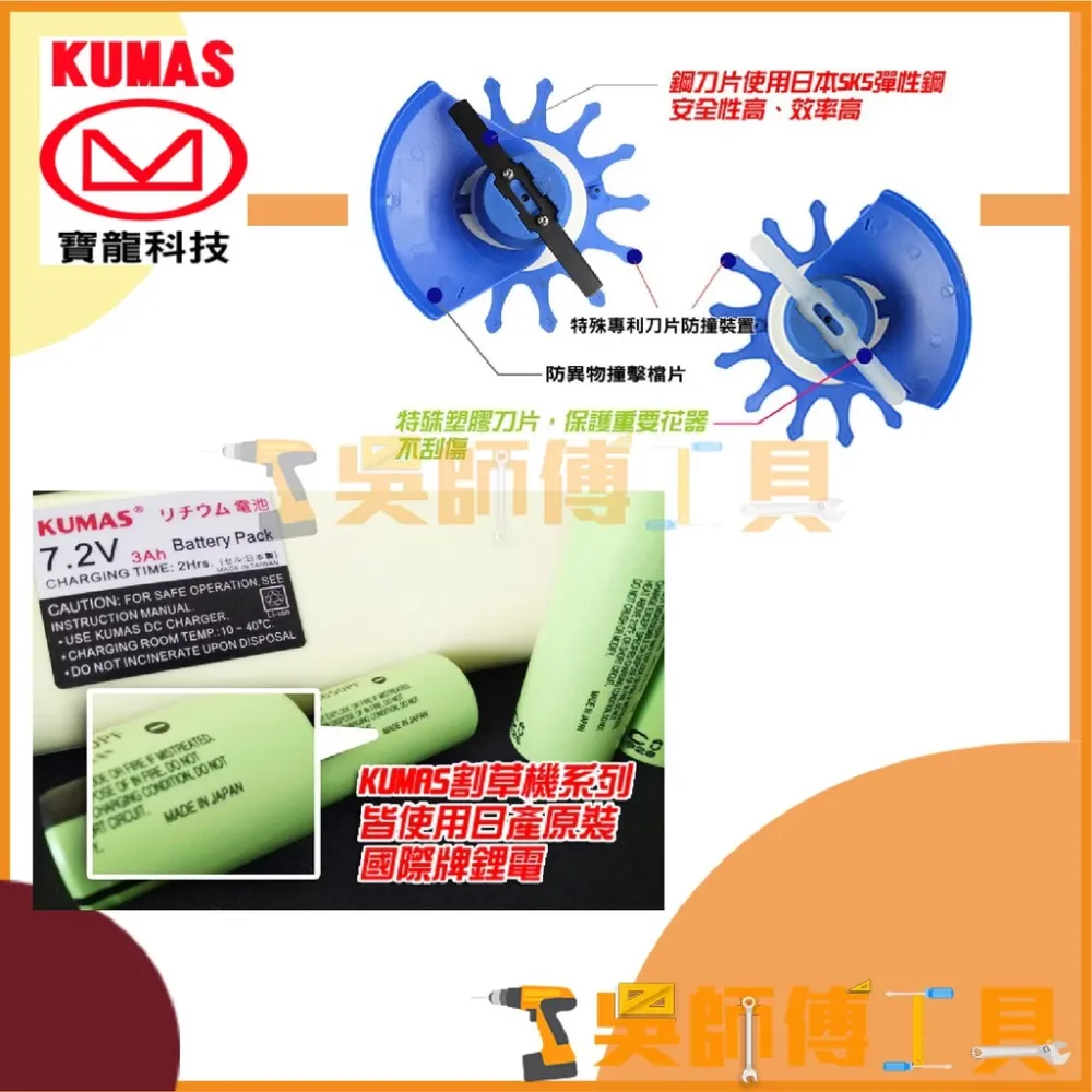 9.寶龍割草機採用日本製PANASONIC鋰電池芯,6AH電池充滿電可使用約60分鐘(視草種而定)