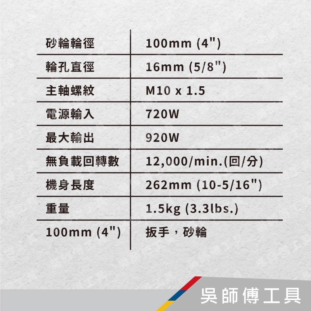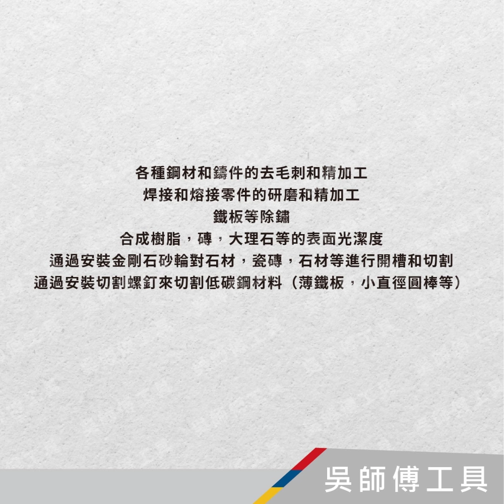 *標準附件:砂輪、拆裝板手。輔助把手。保護蓋