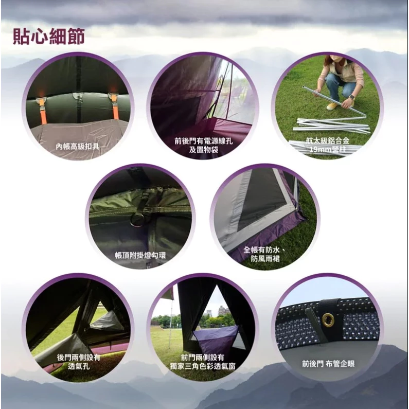 🔹貼心細節,讓您露營生活舒適倍增(掛燈鉤、電源線孔、特殊收納束繩設計、前門中央企眼可拉繩做導雨排水….)