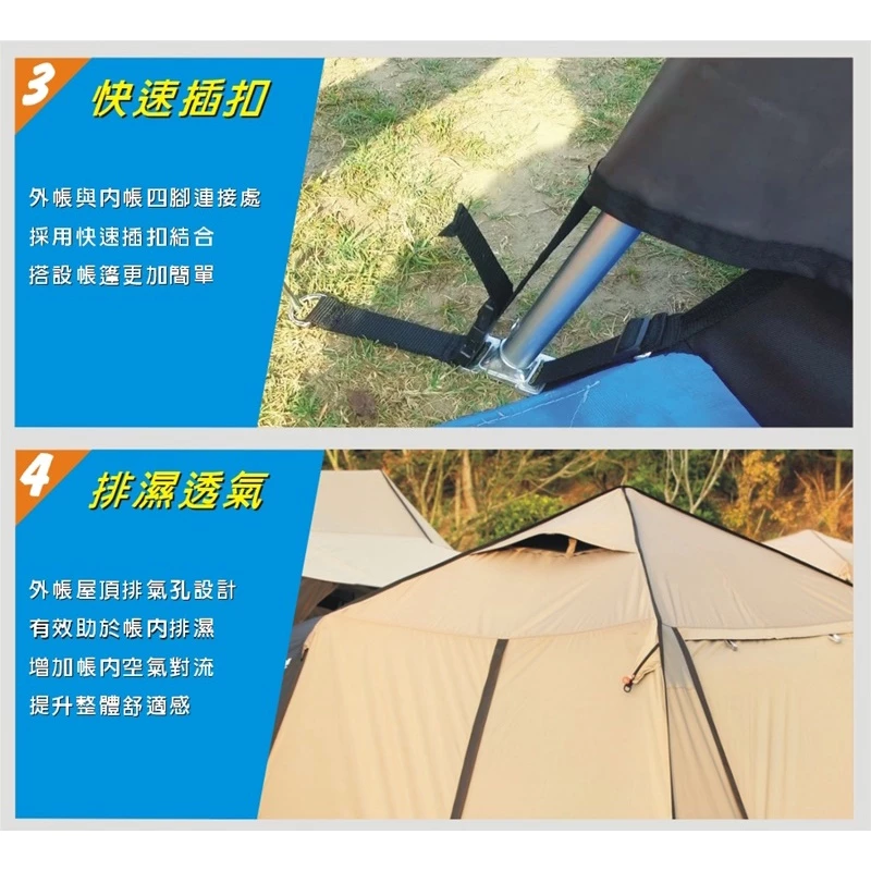🔹內帳:75D特多龍布,上半部大型天井透氣網。(前後有雙門 左右有雙窗,首創紗窗可開啟,半夜下雨不用外出關窗了。)