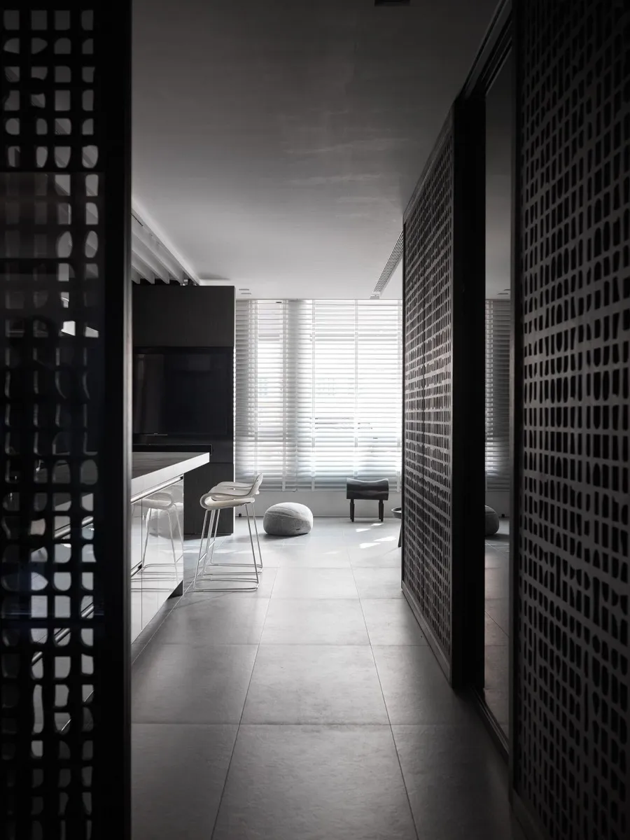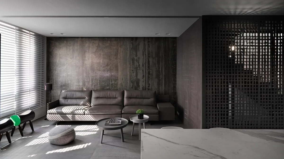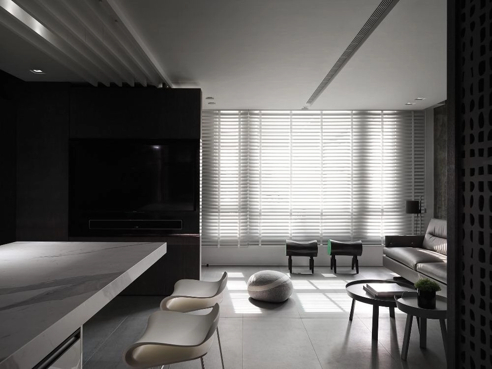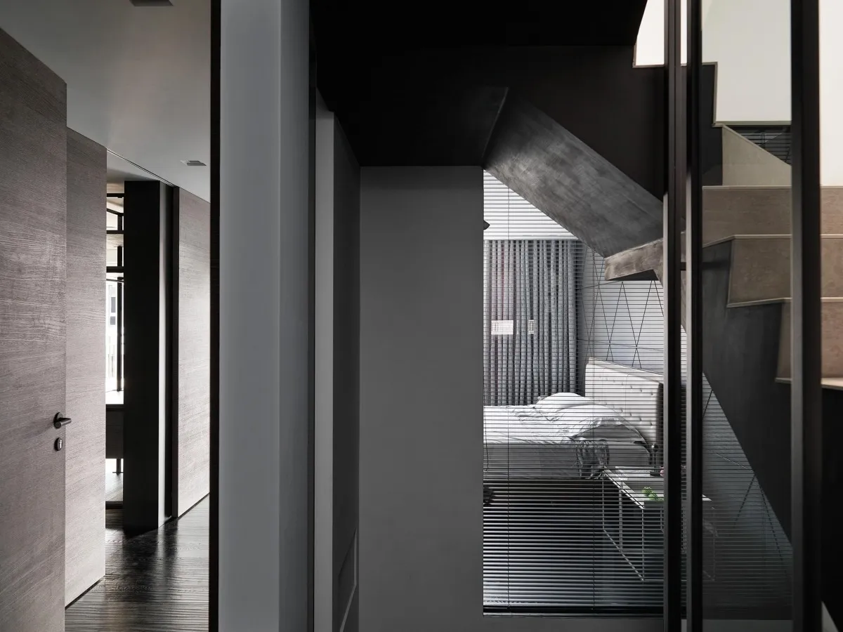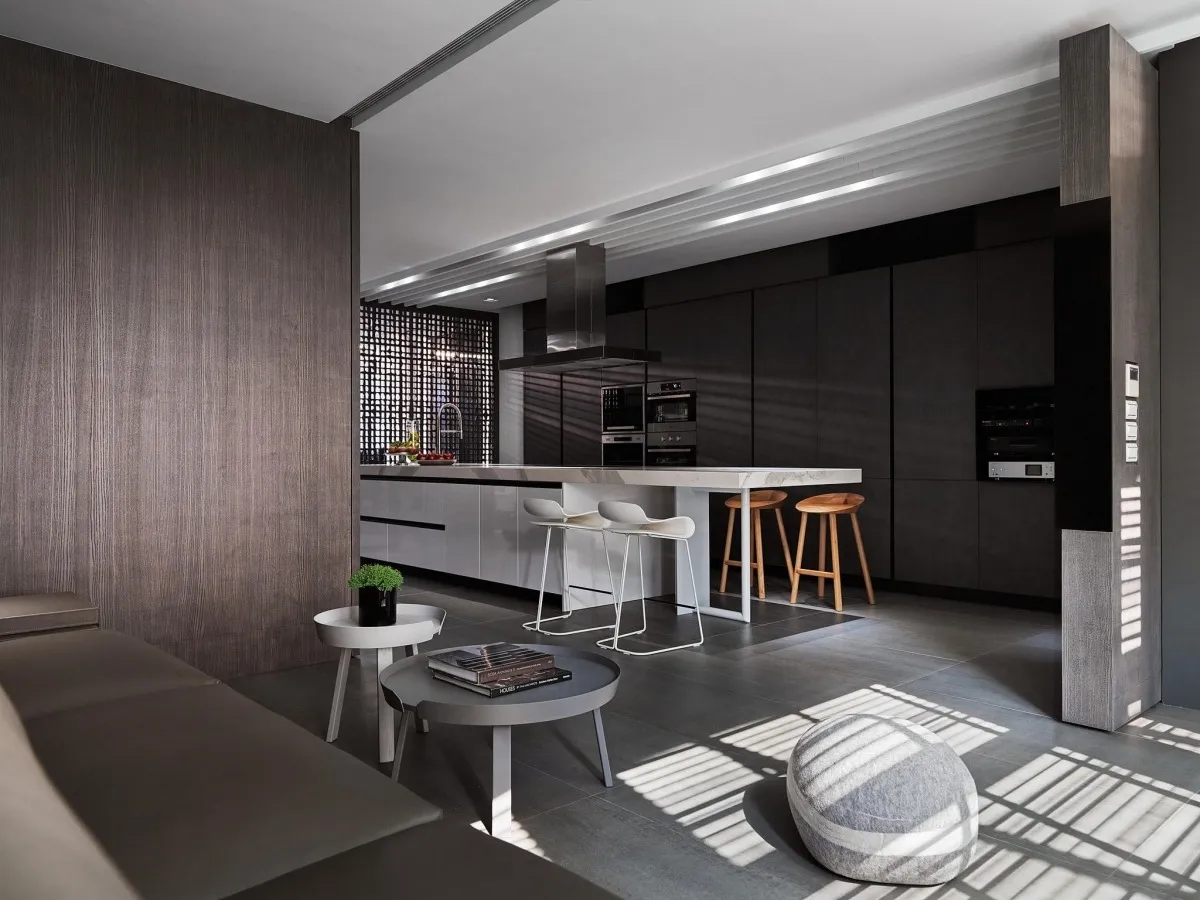 灰色基調為主軸,木、石、鐵件等材璞質豐潤場域,層層疊疊,構築迥然有別於往常之意念,疊牆複壁光影流竄,玄關、客廳、中島貫連,而然俐落寬敞平面,隨興且機動,一入門放下塵囂,場景靜謐猶如慮濁,潛身於山林,隱跡於市井。