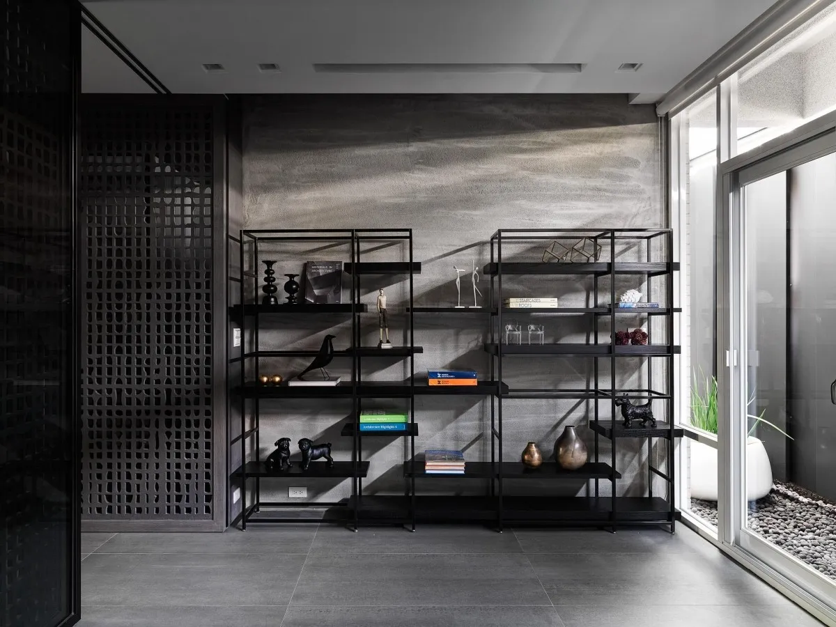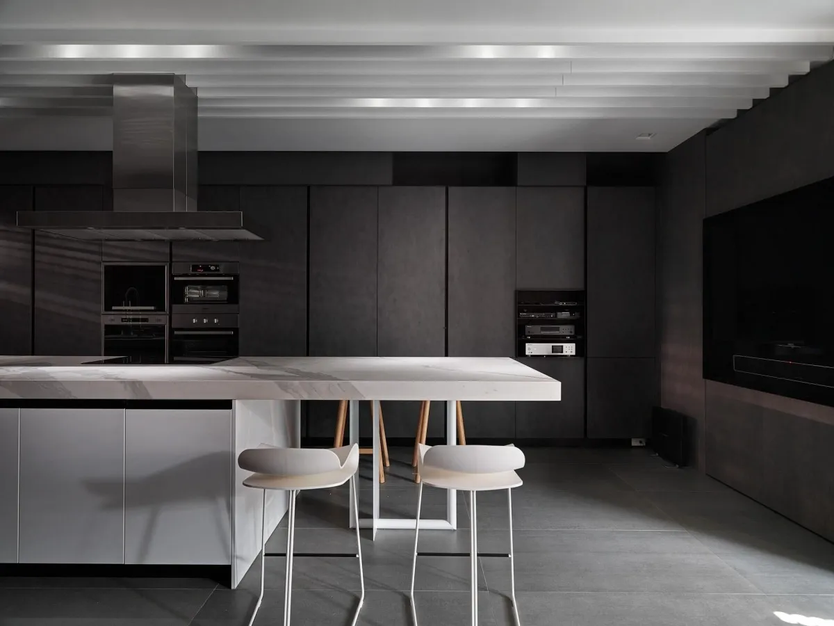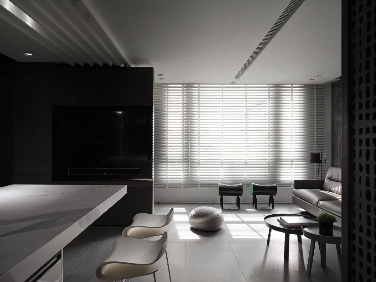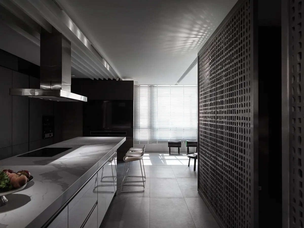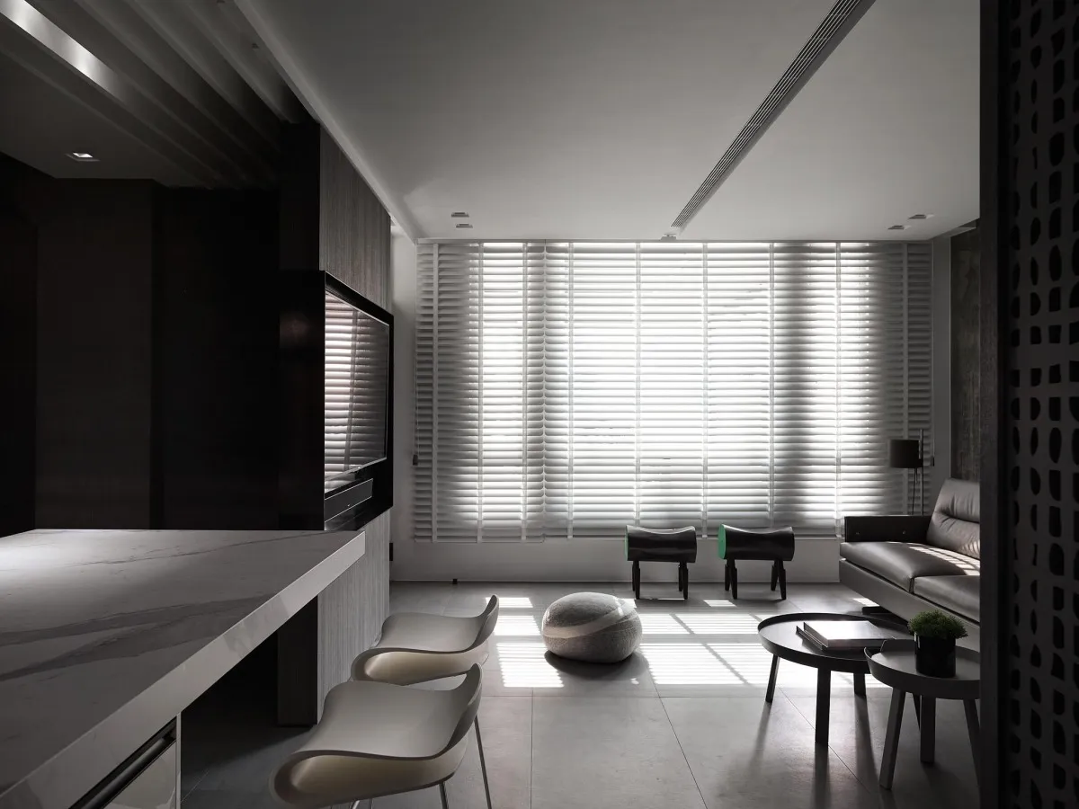 灰色基調為主軸,木、石、鐵件等材璞質豐潤場域,層層疊疊,構築迥然有別於往常之意念,疊牆複壁光影流竄,玄關、客廳、中島貫連,而然俐落寬敞平面,隨興且機動,一入門放下塵囂,場景靜謐猶如慮濁,潛身於山林,隱跡於市井。