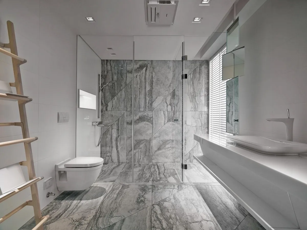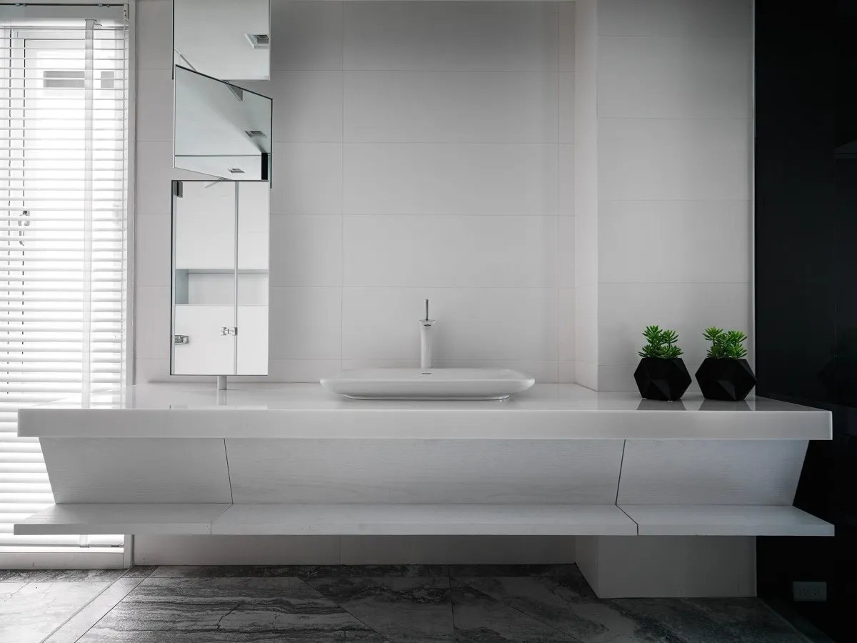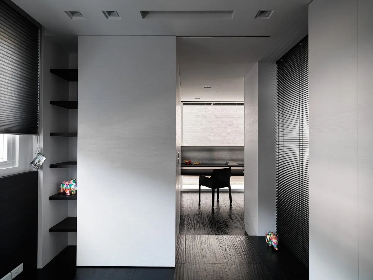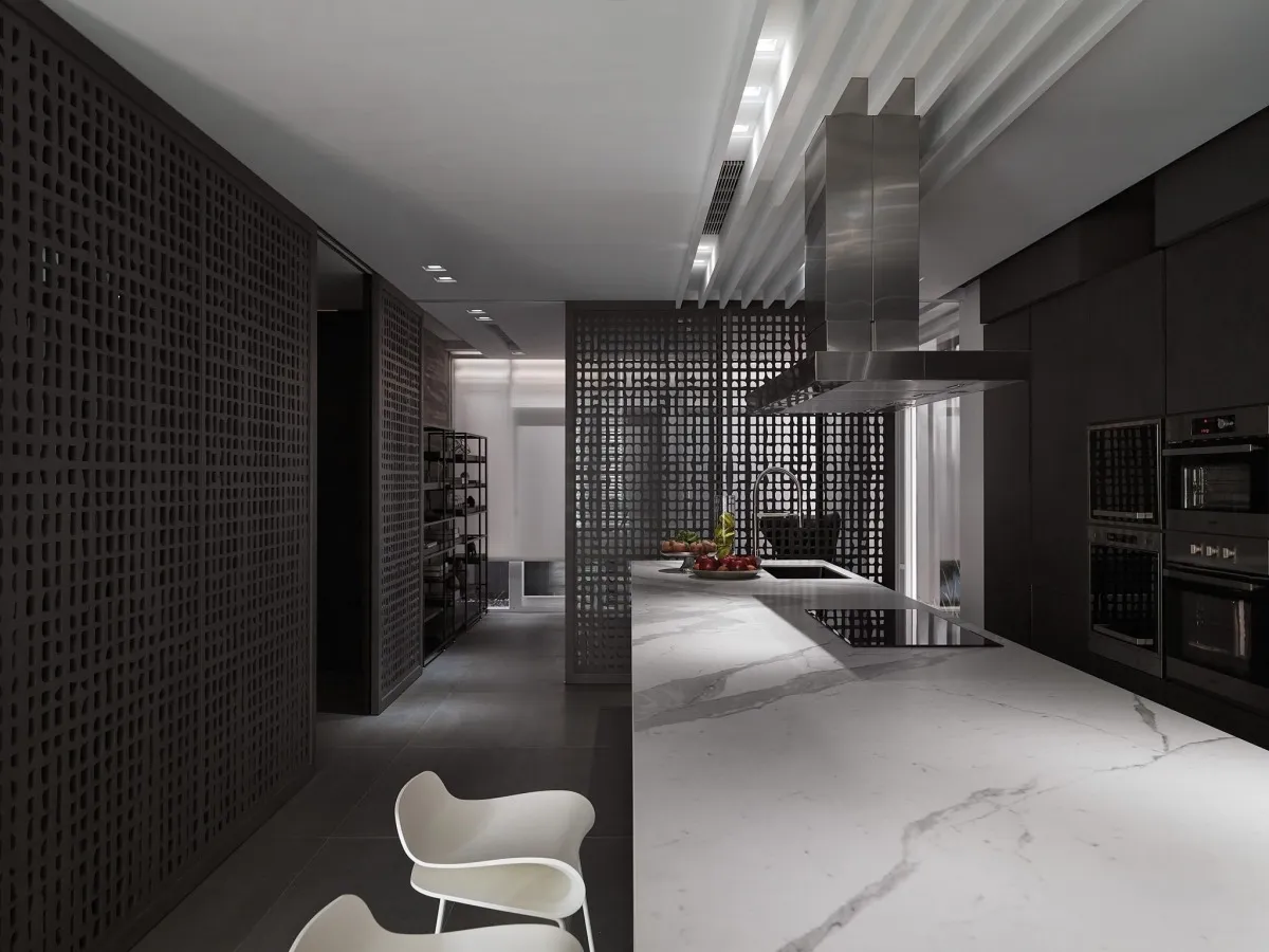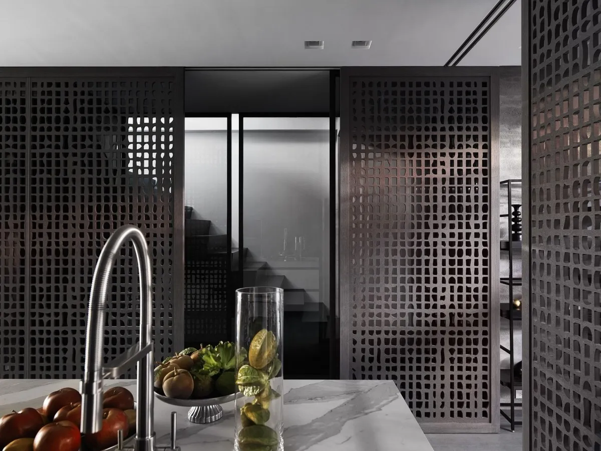灰色基調為主軸,木、石、鐵件等材璞質豐潤場域,層層疊疊,構築迥然有別於往常之意念,疊牆複壁光影流竄,玄關、客廳、中島貫連,而然俐落寬敞平面,隨興且機動,一入門放下塵囂,場景靜謐猶如慮濁,潛身於山林,隱跡於市井。