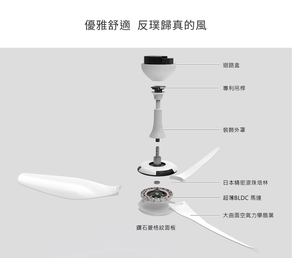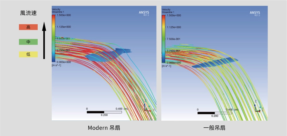 大曲面空氣力學,葉片為雙扭曲線翼型設計,可攔截大量氣流,並利用空氣動力學導流,將氣流均勻分布,可在極低轉速下即可產生平滑無聲的擴散大氣流,顛覆傳統轉速快風量大的思維,Modern吊扇慢速運轉,不僅能產生同樣風量更降低對於人的干擾。