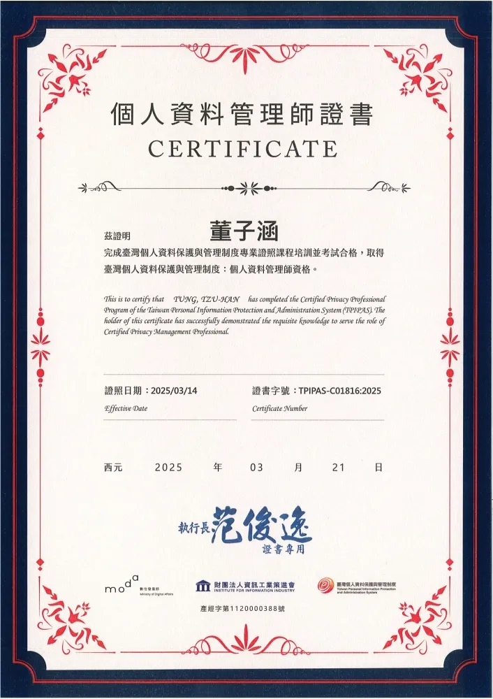 取得台灣個人資料保護與管理制度:個人資料管理師 資格。