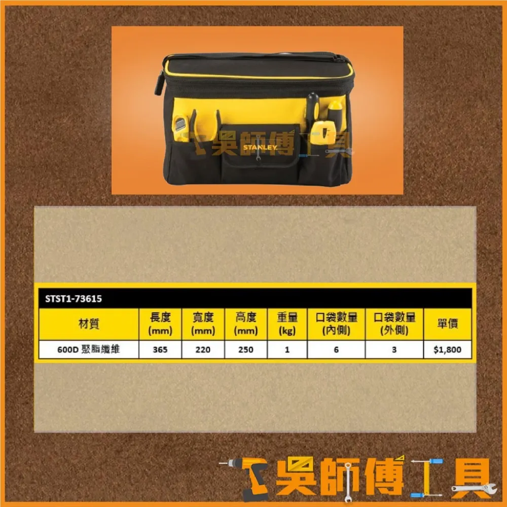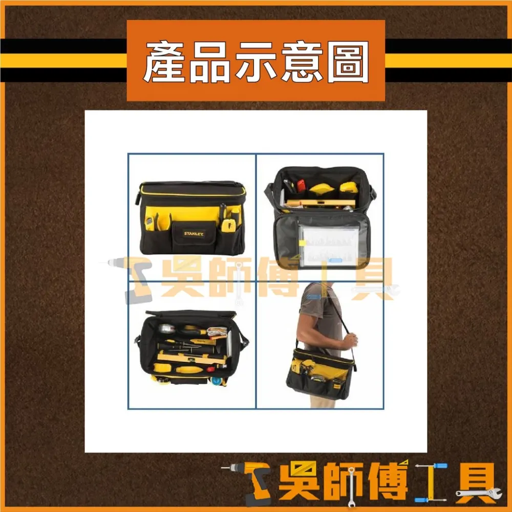 超優質的工具收納包-【STANLEY 14吋多用途工具袋(STST1-73615)】,精美黃黑色時尚大方,車工精細,堅固耐用,內裡多層次的夾層,讓您擺放工具井然有序,一目了然,可肩背、手提,還有扣帶更加牢固,全依您習慣使用,這麼好用的工具袋,不僅方便收納工具,更是外出攜帶的最佳選擇!