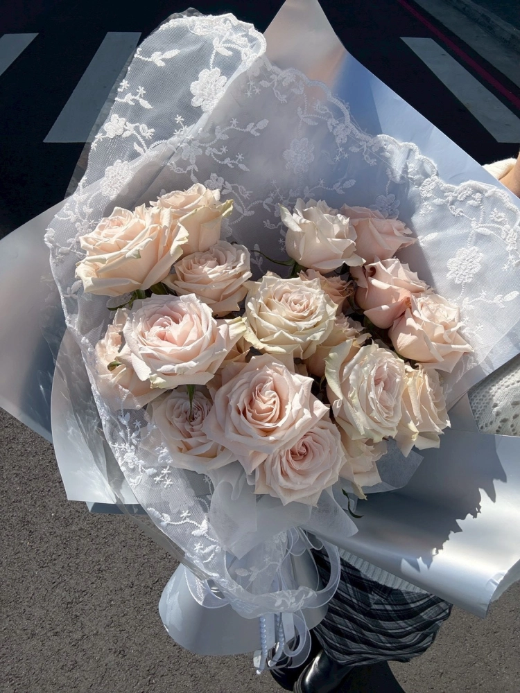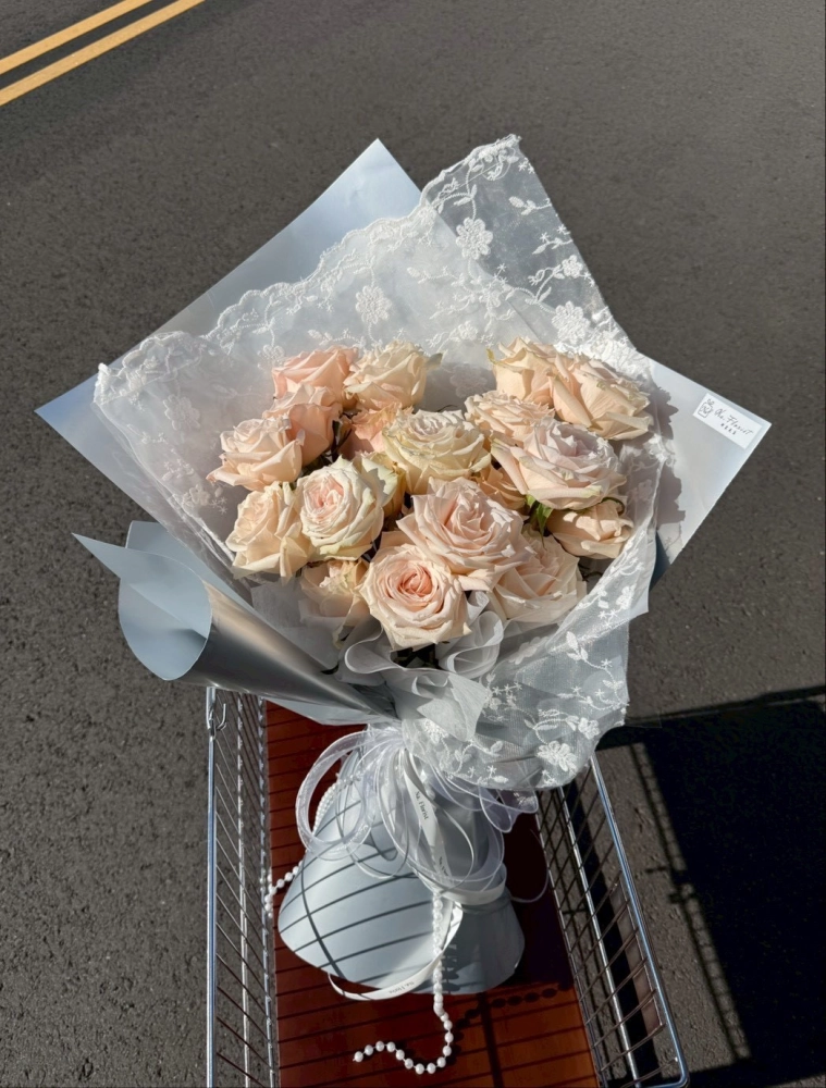 香檳色的花瓣,搭配蕾絲包裝,像一場不需多言的浪漫,優雅、內斂、閃著柔光。