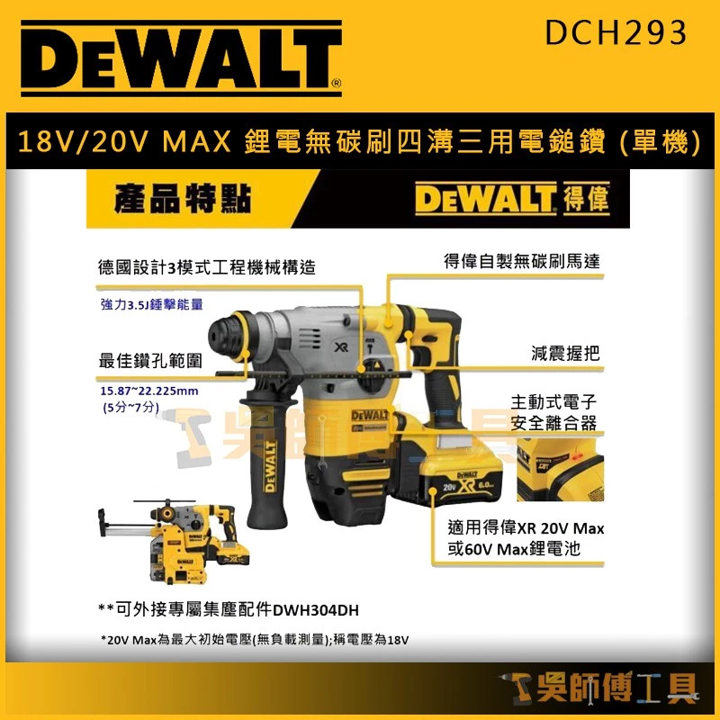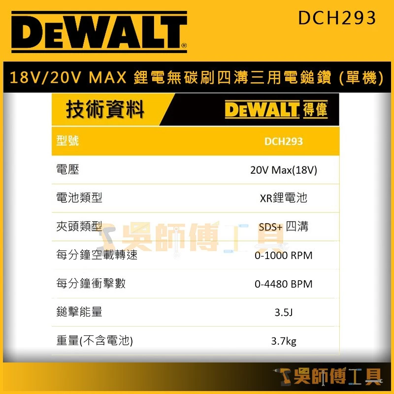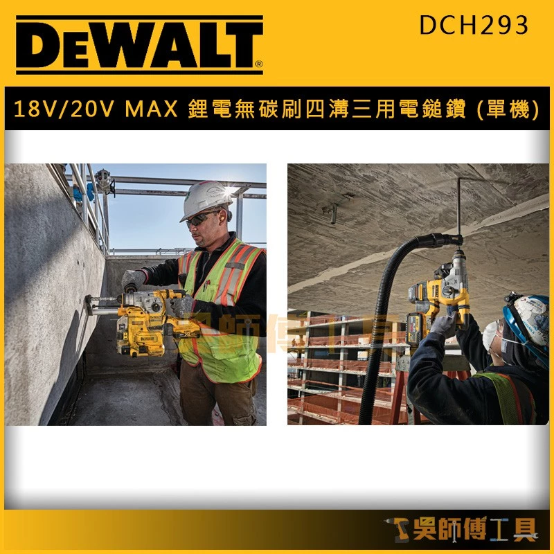 【DCH293】18V/20V MAX鋰電無碳刷四溝三用電鎚鑽(單機)(產地歐洲)