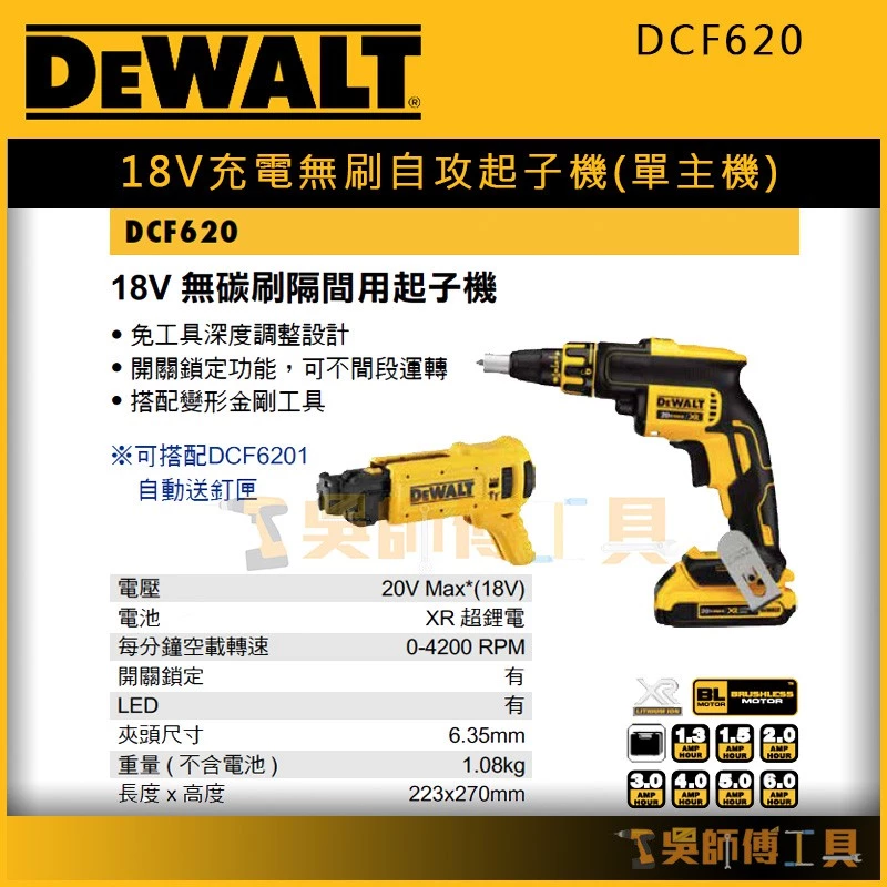 【DCF620】18V充電無刷自攻起子機/隔間用起子機/浪板機(單機)(箱裝)