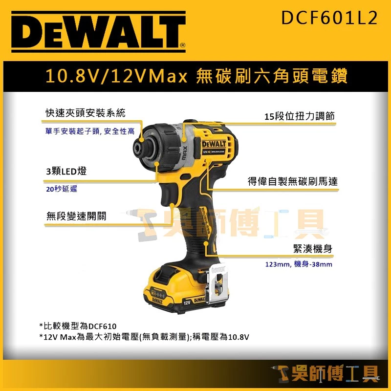 商品得偉 DEWALT DCF815D2 10.8V鋰電衝擊起子機/電鑽(2.0AH雙電全配)
