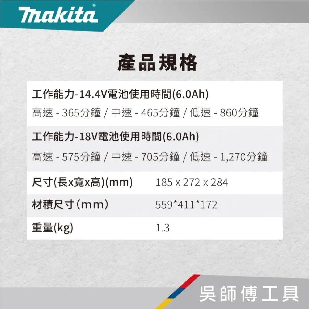 工作能力-18V電池使用時間(6.0Ah):高速 - 575分鐘 / 中速 - 705分鐘 / 低速 - 1,270分鐘