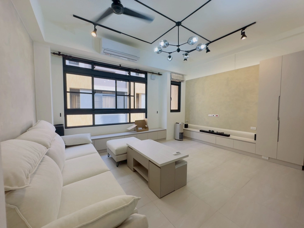 ・視覺焦點:牆面質感豐富,搭配簡約電視櫃與線條柔和的家具,讓空間不單調。