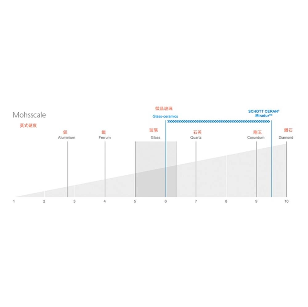 1.堅硬:採用耐刮微晶玻璃,宛如鑽石般堅硬,可減少95%沙子的刮痕與減少70%研磨性海綿的刮痕,堅固易清理。