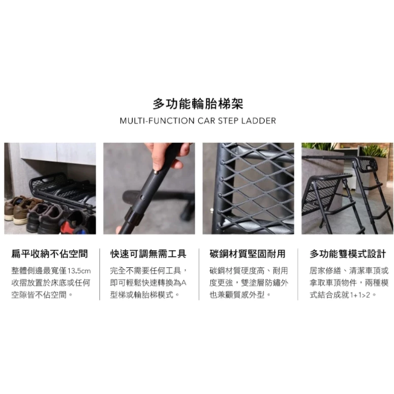 🔥快速可調無需工具,完全不需要任何工具,即可輕鬆快速轉換為A型梯或輪胎梯模式。