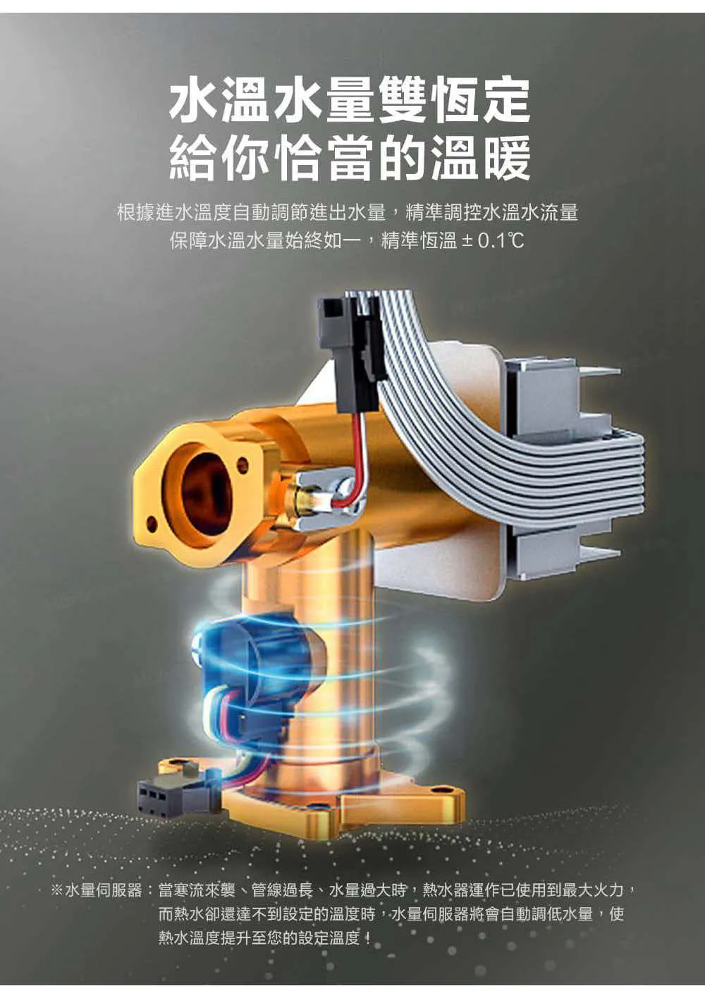 • 水量伺服器:調控溫水流量,達到精準恆溫
