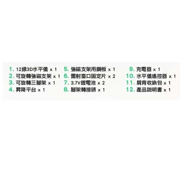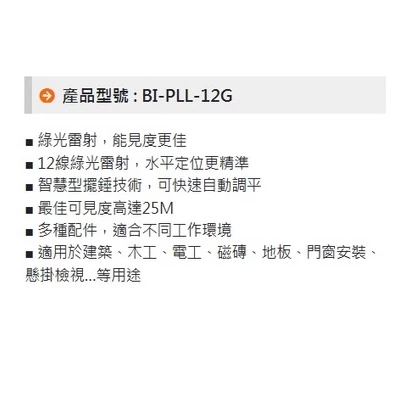 •3D 12線設計,綠光雷射水平儀,高靈敏度,更佳的標線效果,更好的定位模式,自動調平系統,靈活性、穩定性佳