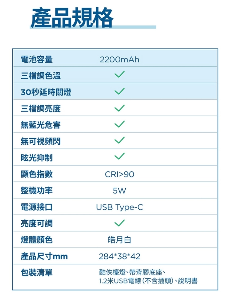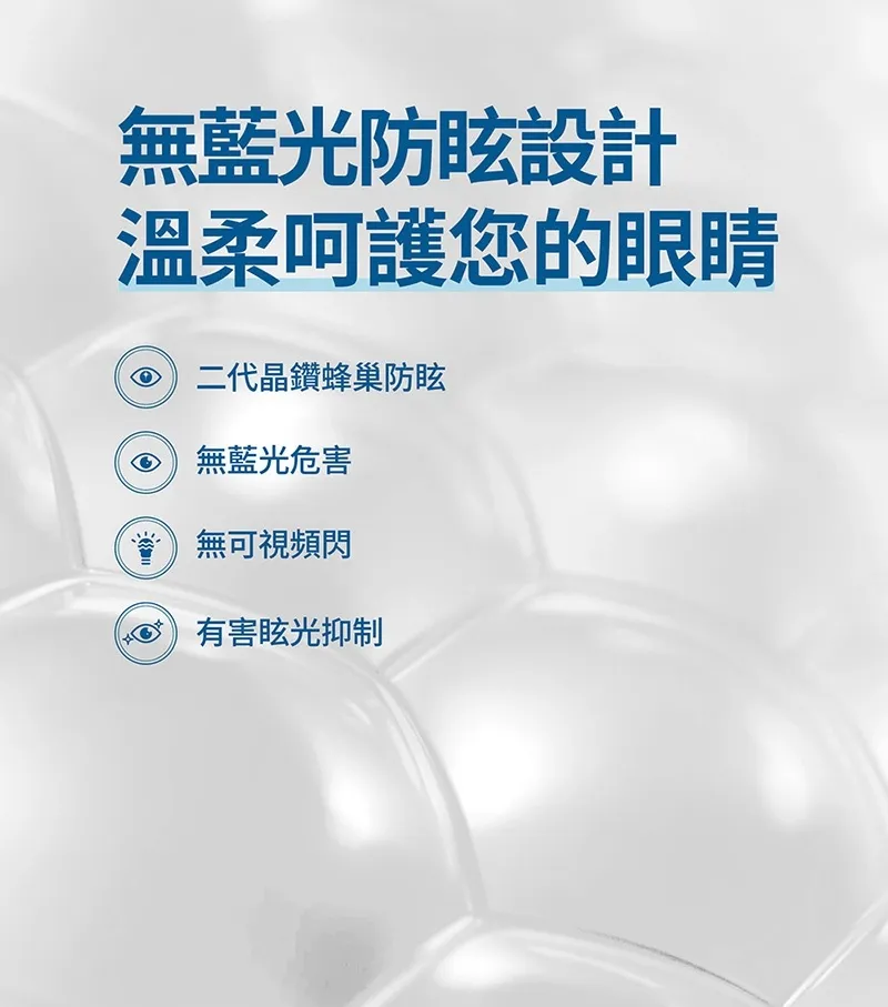 無藍光危害、二代晶鑽蜂巢設計防眩光、無可視頻閃