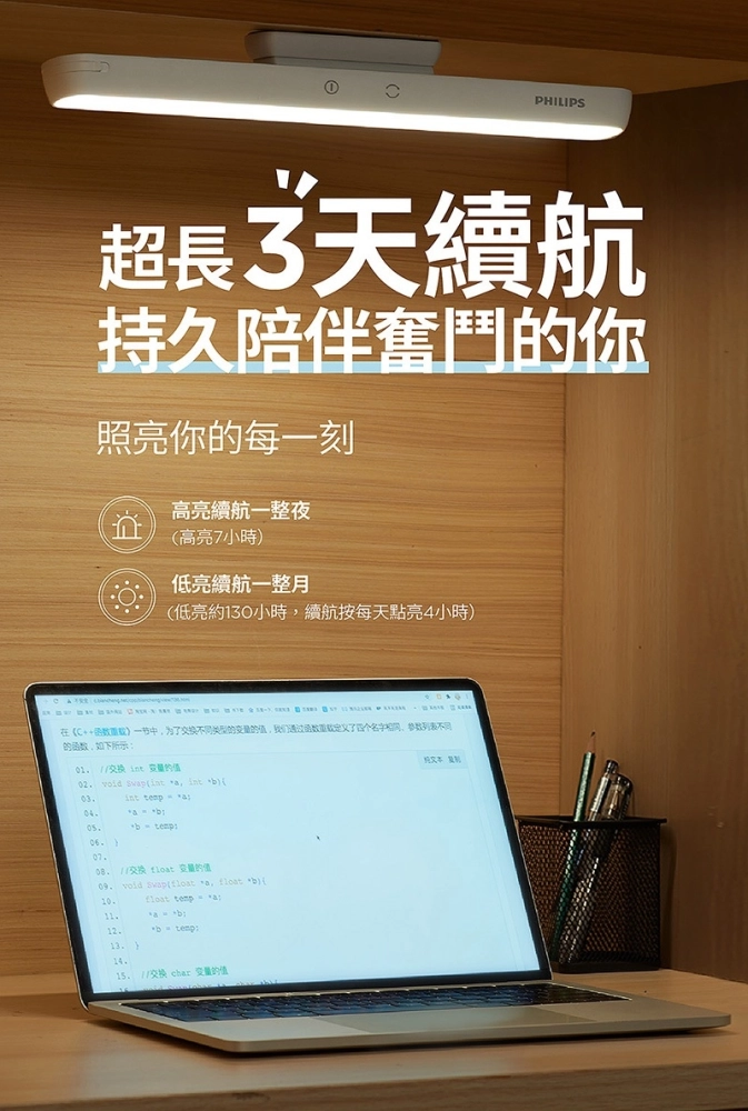 超持久續航力長達三天(高亮度續航7小時/低亮度續航130小時)
