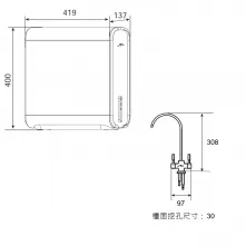 流量 洗滌水流量3.6L/min;日造水量約5200L(1300加侖) ;飲用水流量1.3L/min;日造水量約2000L(500加侖)
