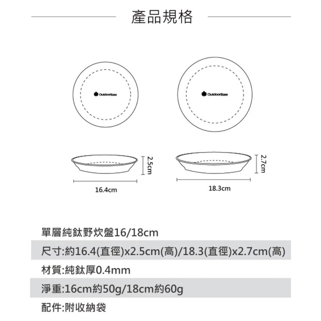 【綠色工場】Outdoorbase 野夫炊煙 單層純鈦野炊淺盤 鈦碗 鈦餐具 鈦金屬 鈦盤 摺疊盤 露營盤 野營登山