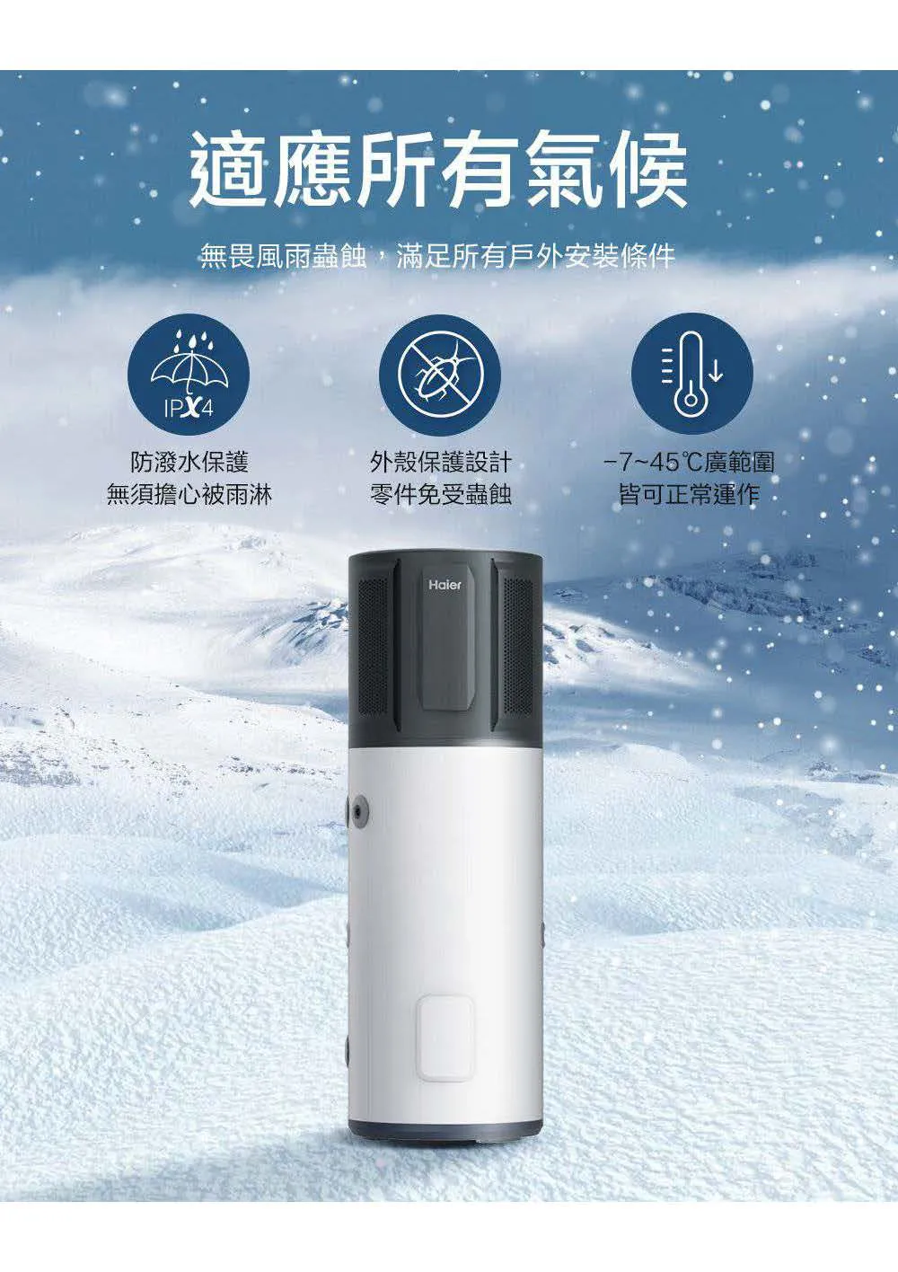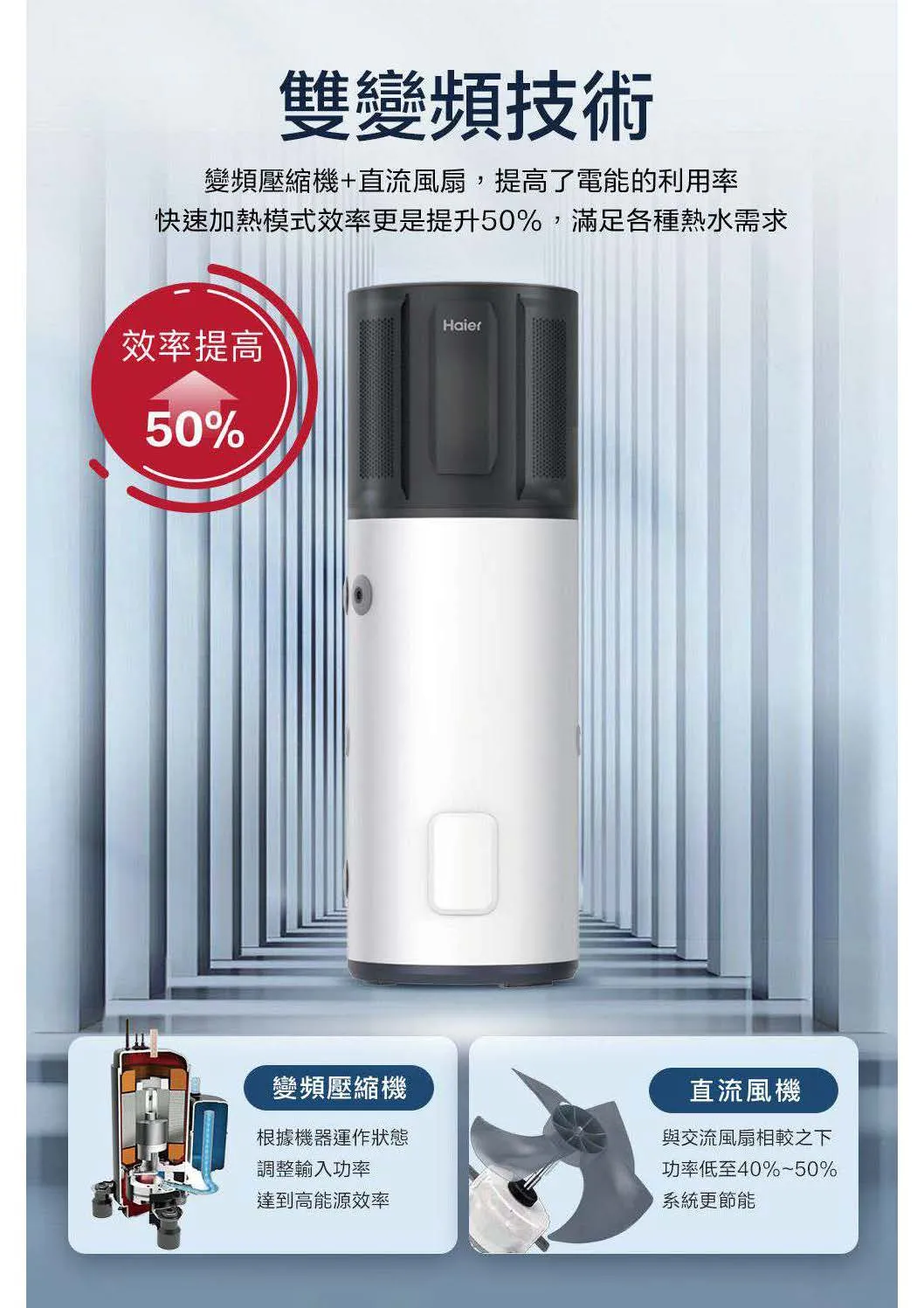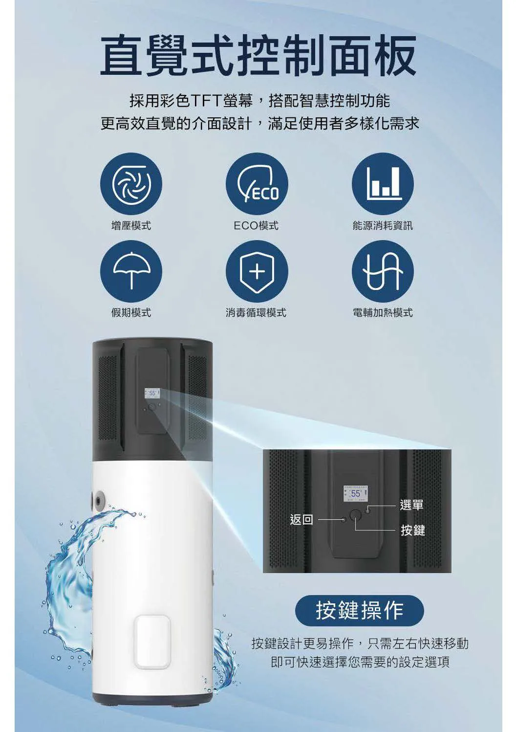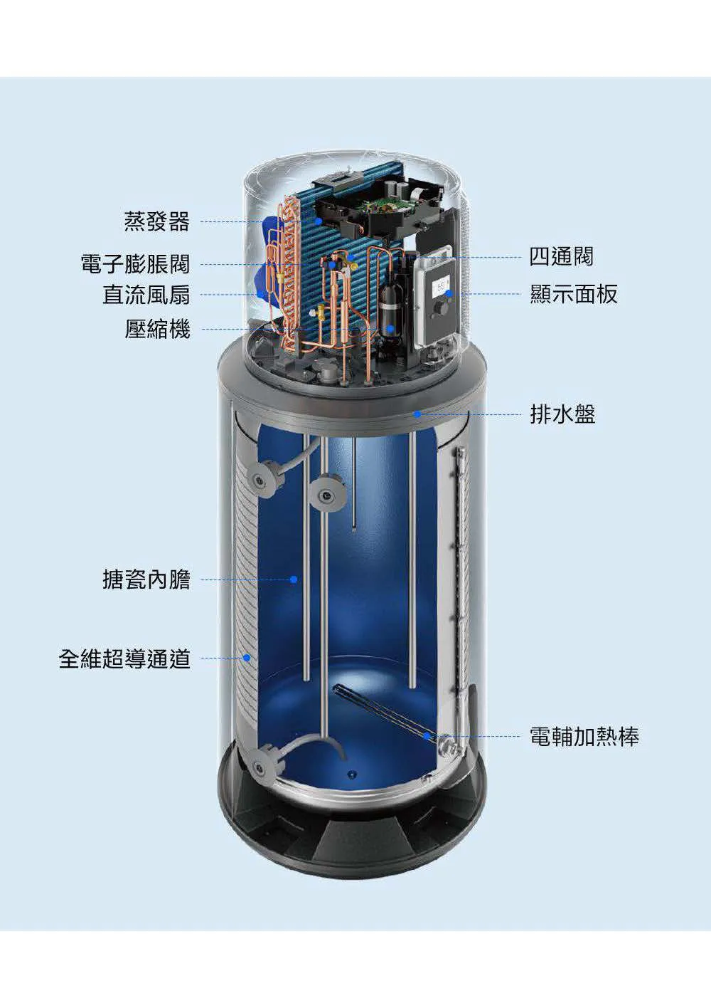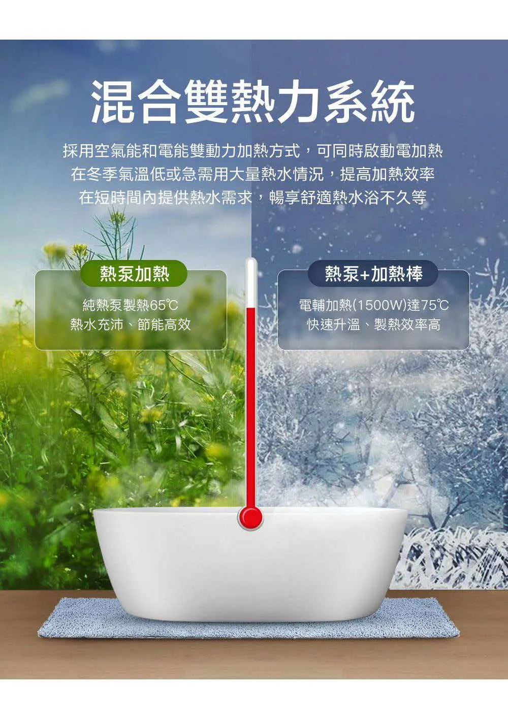 • 混和雙熱力系統:電熱輔助與熱泵雙熱力,節省等待時間