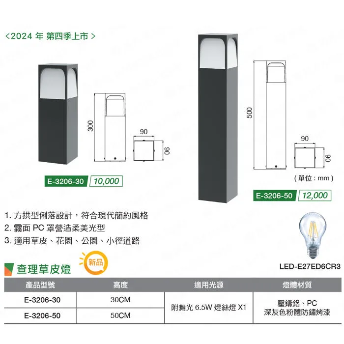 商品舞光 波特草皮燈 30公分/ 50公分 附LED-E27-6.5W燈泡 E-3216 戶外燈 庭園燈 路燈