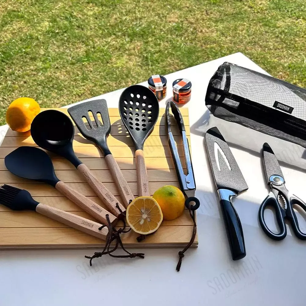 仙德曼 SADOMAIN 露營餐廚五金9件組(附收納網袋)【綠色工場】露營廚具 菜刀 湯勺 煎匙 油刷 飯匙