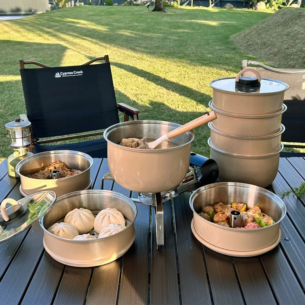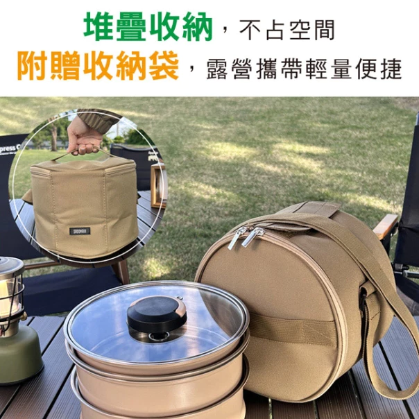 仙德曼 露營蒸鍋套組 【綠色工場】Sadomain 附圓形收納包 露營鍋具組 湯鍋 收納鍋 可堆疊 304不鏽鋼
