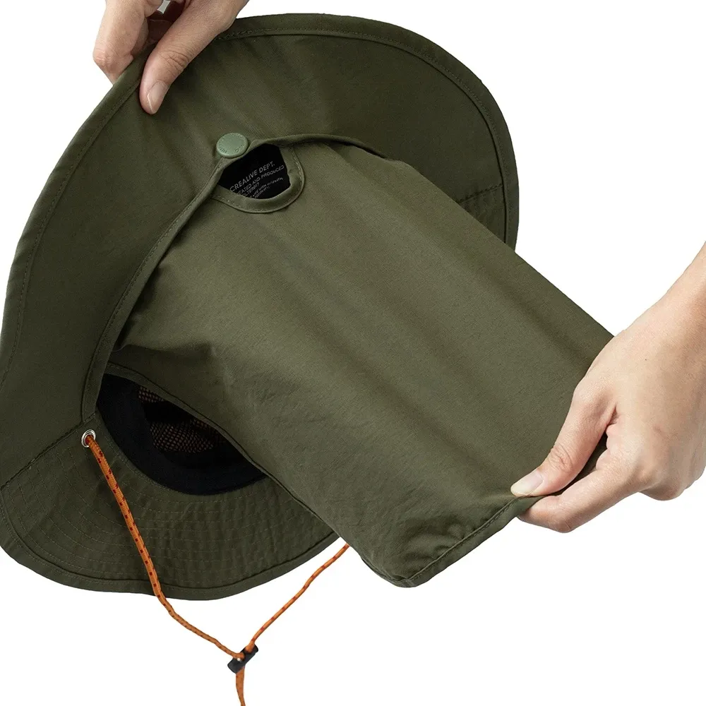 👉帽身附調節釦可調整帽圍尺寸,特別設計可收納式遮陽防曬布以及可拆式調節帽繩,展現絕佳的機能質感與戶外風格。