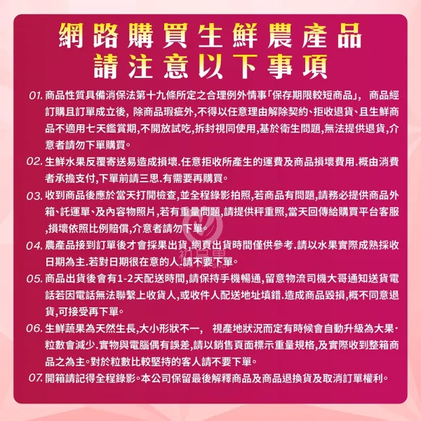 (1)商品性質具備消保法第十九條所定之合理例外情事「保存期限較短商品」, 商品經訂購且訂單成立後, 除商品瑕疵外,不得以任意理由解除契約、拒收退貨、且生鮮商品不適用七天鑑賞期,不開放試吃,拆封視同使用,基於衛生問題,無法提供退貨,介意者請勿下單購買。