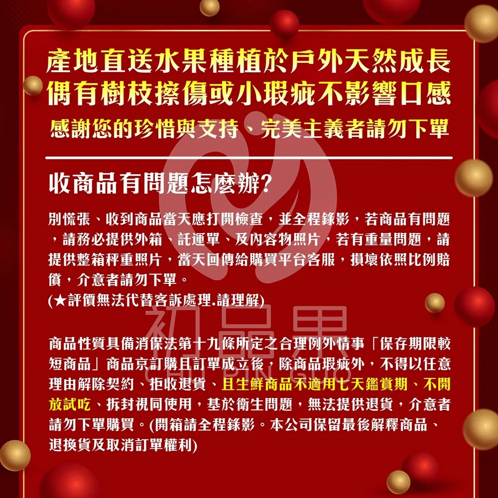 | (2)生鮮水果反覆寄送易造成損壞.若客無故取消訂單或拒收商品,所產生的運費及商品損壞費用.概由消費者承擔支付,若客不願意賠償店家損失,將一律以毀損罪提告,下單前請三思.有需要再購買。 |