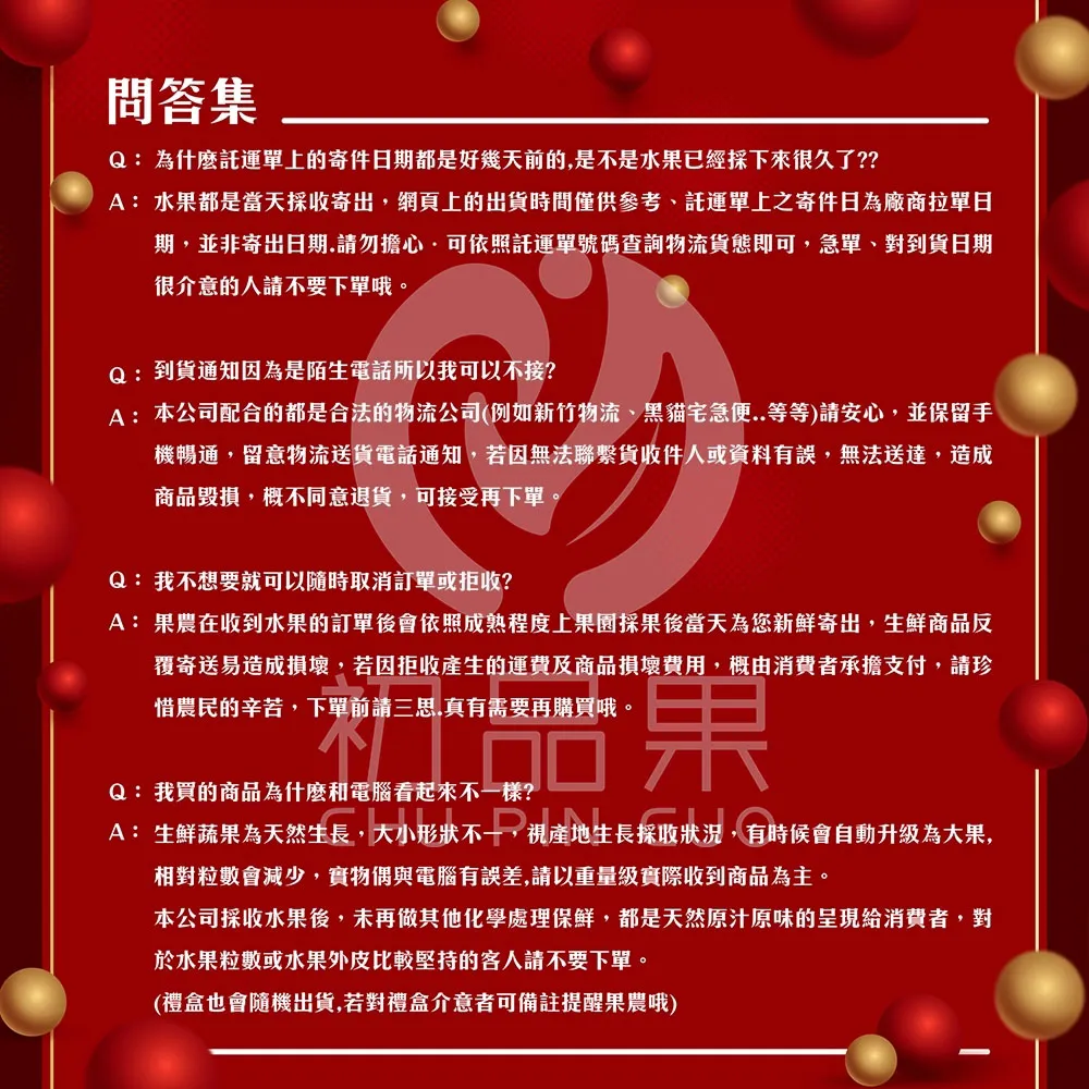 | (4)農產品天然成長採收出貨,採收期有可能受到天氣等種種不可控的天然因訴影響原訂出貨日期,可以接受再下單,急單、指定日期.....無法配合水果天然成長熟成的人請不要下單。 |