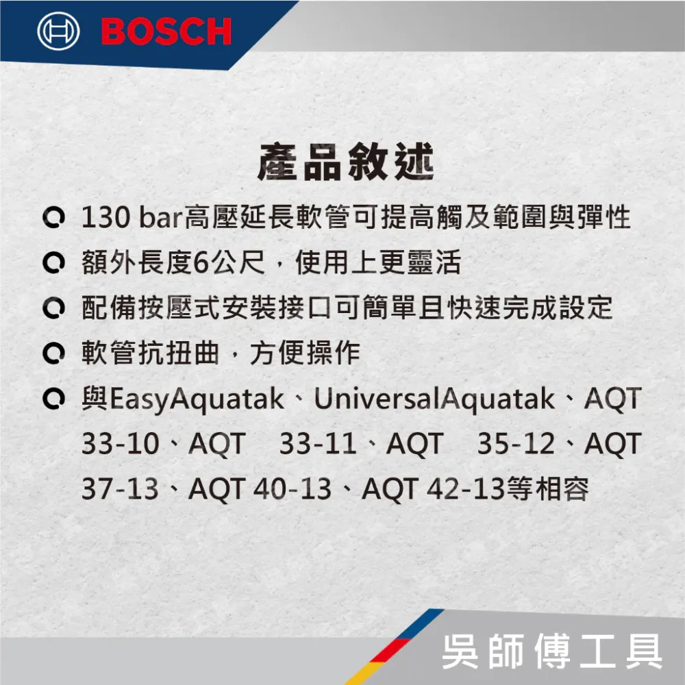 ●與EasyAquatak、UniversalAquatak、AQT 33-10、AQT 33-11、AQT 35-12、AQT 37-13、AQT 40-13、AQT 42-13等相容列,使其成為任何工作的完美配件