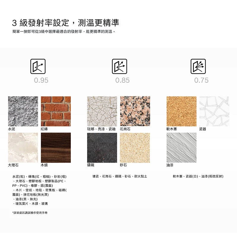 ●簡易 – 只要一按立即顯示偵測結果,3級發射率可選擇,測溫更精準