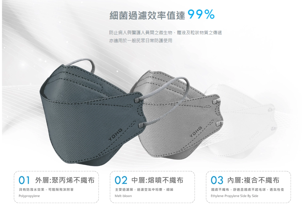 熔噴阻隔層效率達BFE99%,符合CNS14774國家標準品質