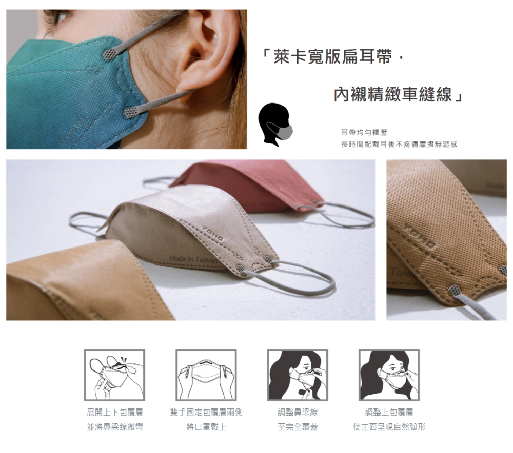高密度彈性纖維耳帶均勻釋壓,可依個人臉型微幅調整,長時間佩戴耳後不疼痛