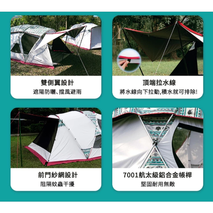 材 質: 外帳/150D聚酯牛津布遮光塗層,PU防水,頂級彈性防水貼條,Teflon撥水(耐水壓3000mm) 內帳/190T聚酯塔夫塔布底布/300D牛津布(PU防水防水貼條PVC夾網布補強耐水壓4000mm) 帳桿/7001鋁合金(直徑約16mm,14mm) 附配件: /營釘6mm*8吋/營繩5mm/收納袋重 量:約20kg