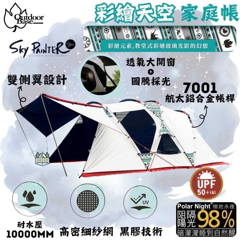 彩繪天空 Outdoorbase 歡樂家庭帳【綠色工場】SKYPAINTER 一房一廳帳 別墅帳 黑膠帳 4人帳 隧道帳