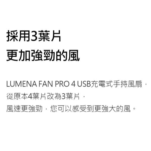 🔹LUMENA FAN PRO 4 USB充電式手持風扇·,從原本4葉片改為3葉片,風速更強勁,您可以感受到更強大的風。